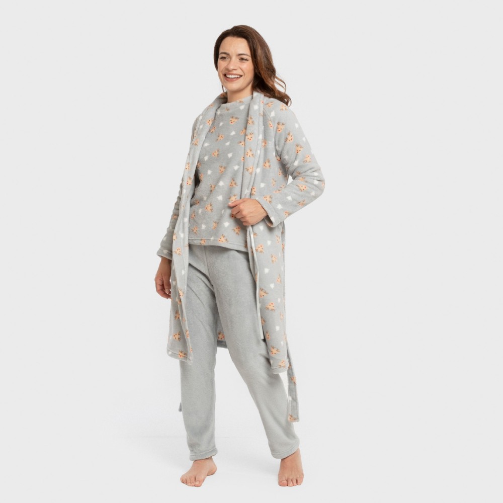 Bata con estampado navideño de renos y abetos sobre un fondo azul con tejido de coralina muy suave ajustable con cinturón.