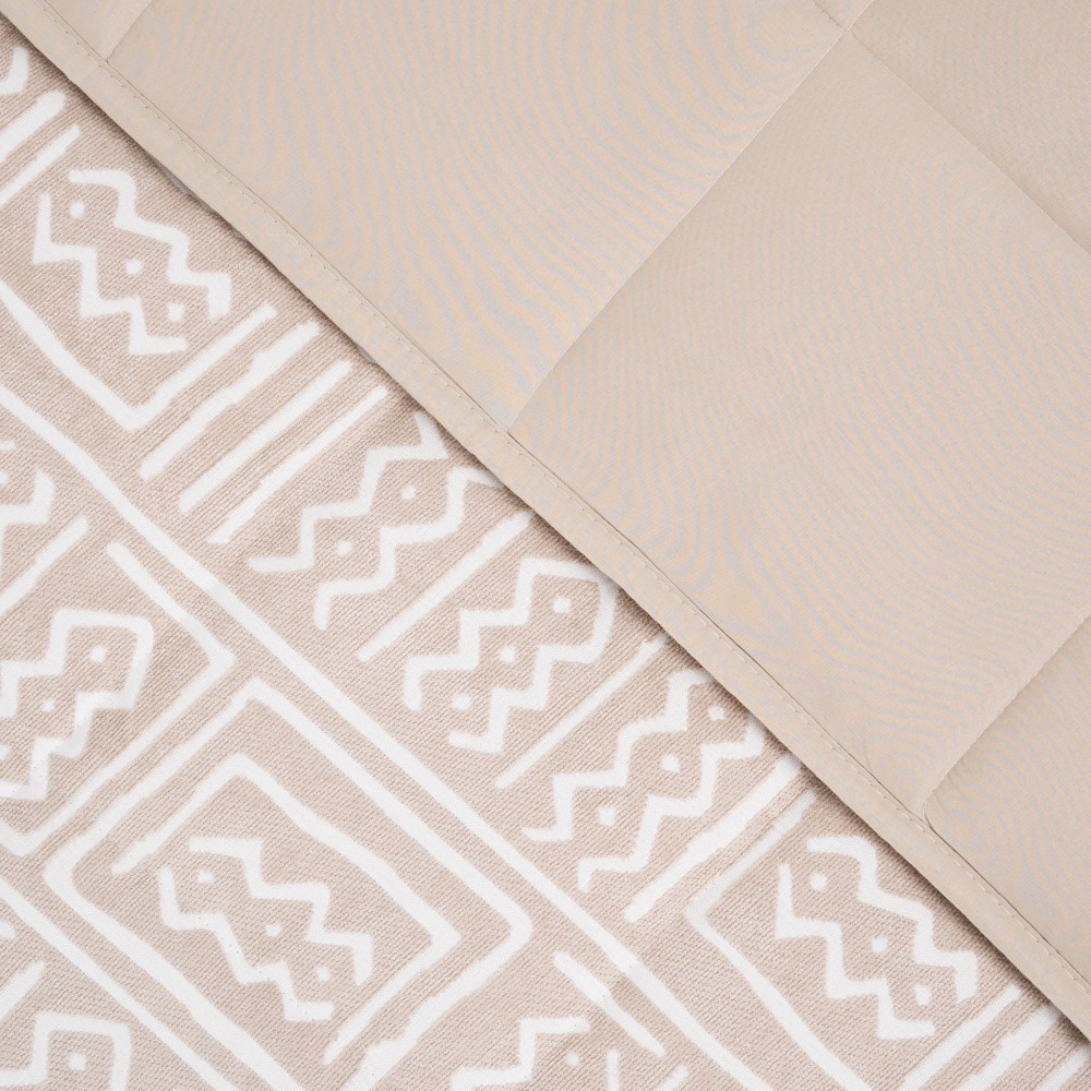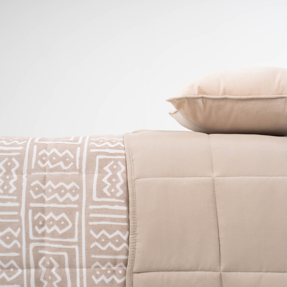 Colcha de 120gr. Cara delantera estampada con un diseño de estilo étnico en color blanco sobre un fondo arena en tejido chenilla que le aportan un efecto brillo estiloso y original.