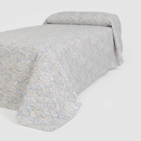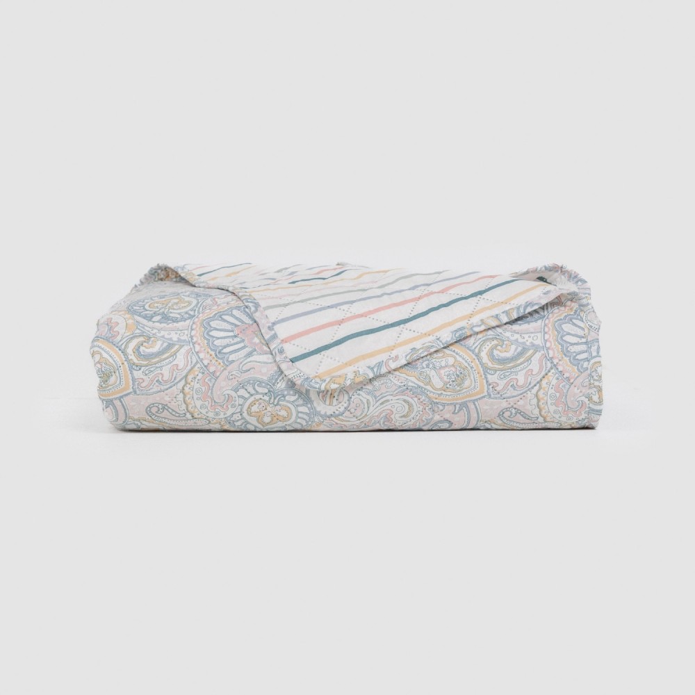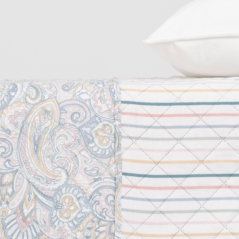 Presenta un estampado cachemir en tonos verdes, rosas y beiges sobre un fondo blanco, la cara trasera es de rayas en los mismos tonos.