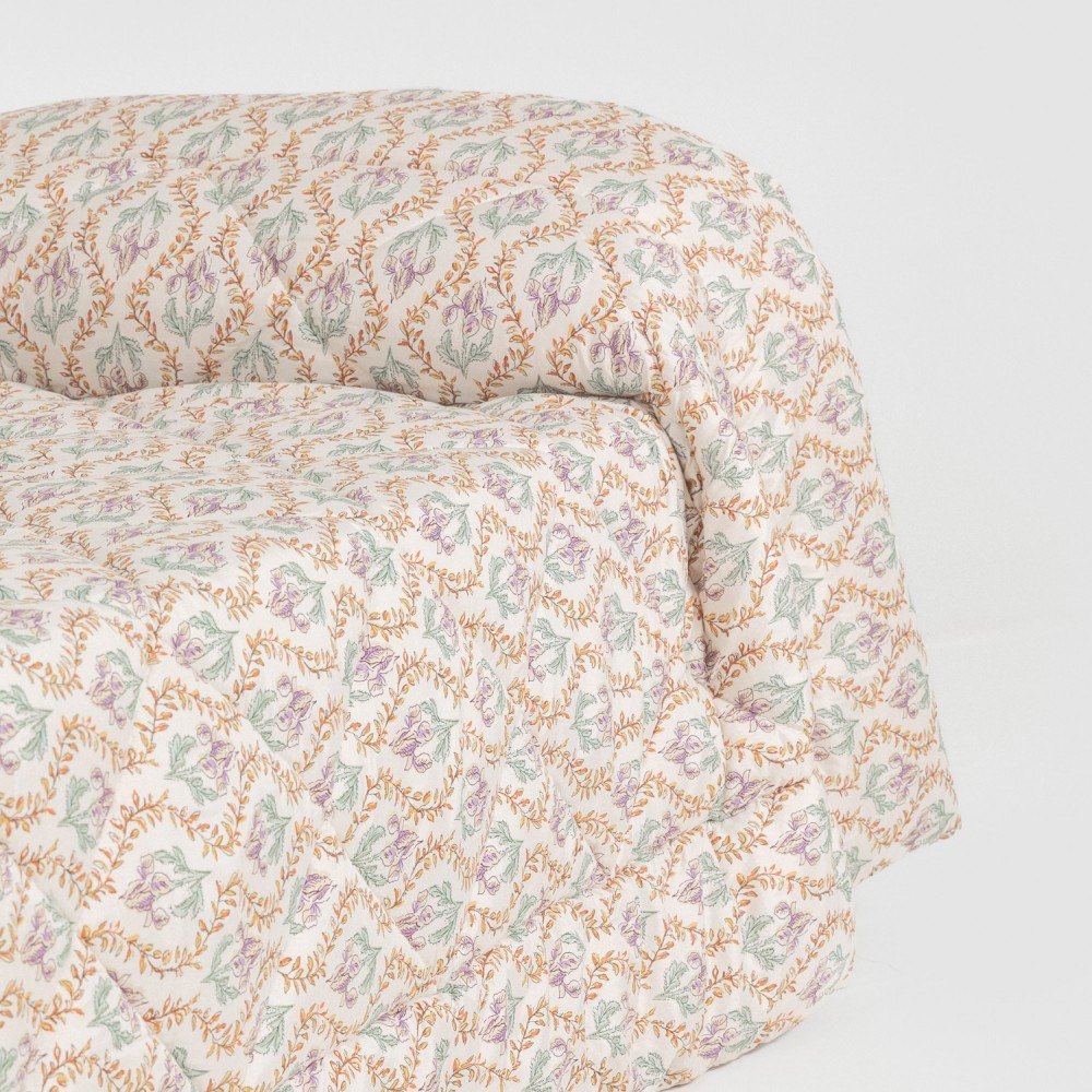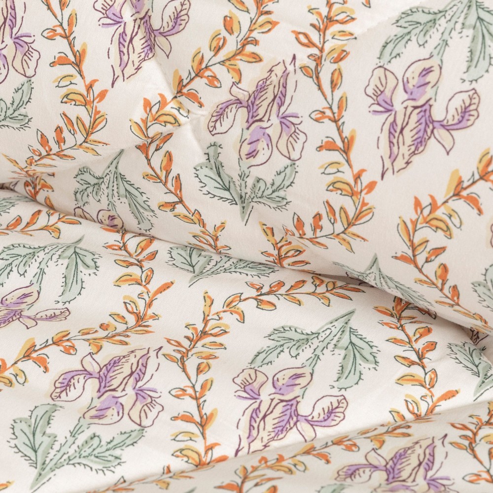 Cara frontal con estampado original de flores y hojas en tonos verdes, lilas y beiges sobre un fondo blanco, la cara trasera cuenta con el mismo diseño.
