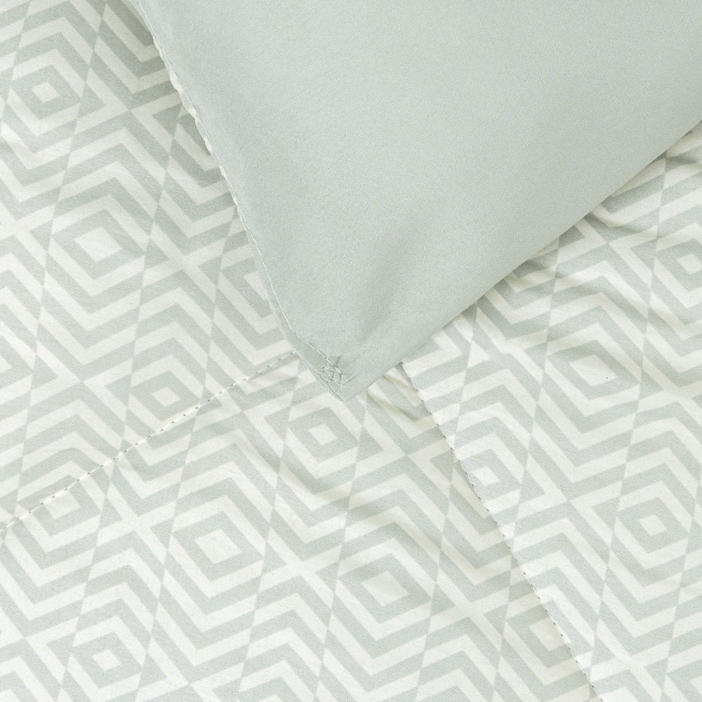 Cara frontal con estampado geométrico de color gris sobre un fondo blanco, la cara trasera es gris lisa.