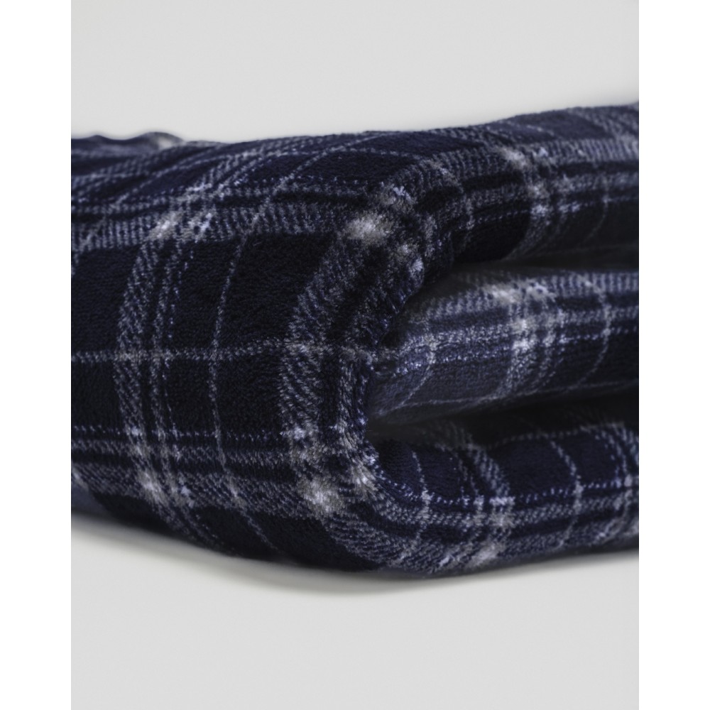 Presenta un estampado de cuadros y rayas en tonos grises sobre un fondo azul marino en tejido coralina.