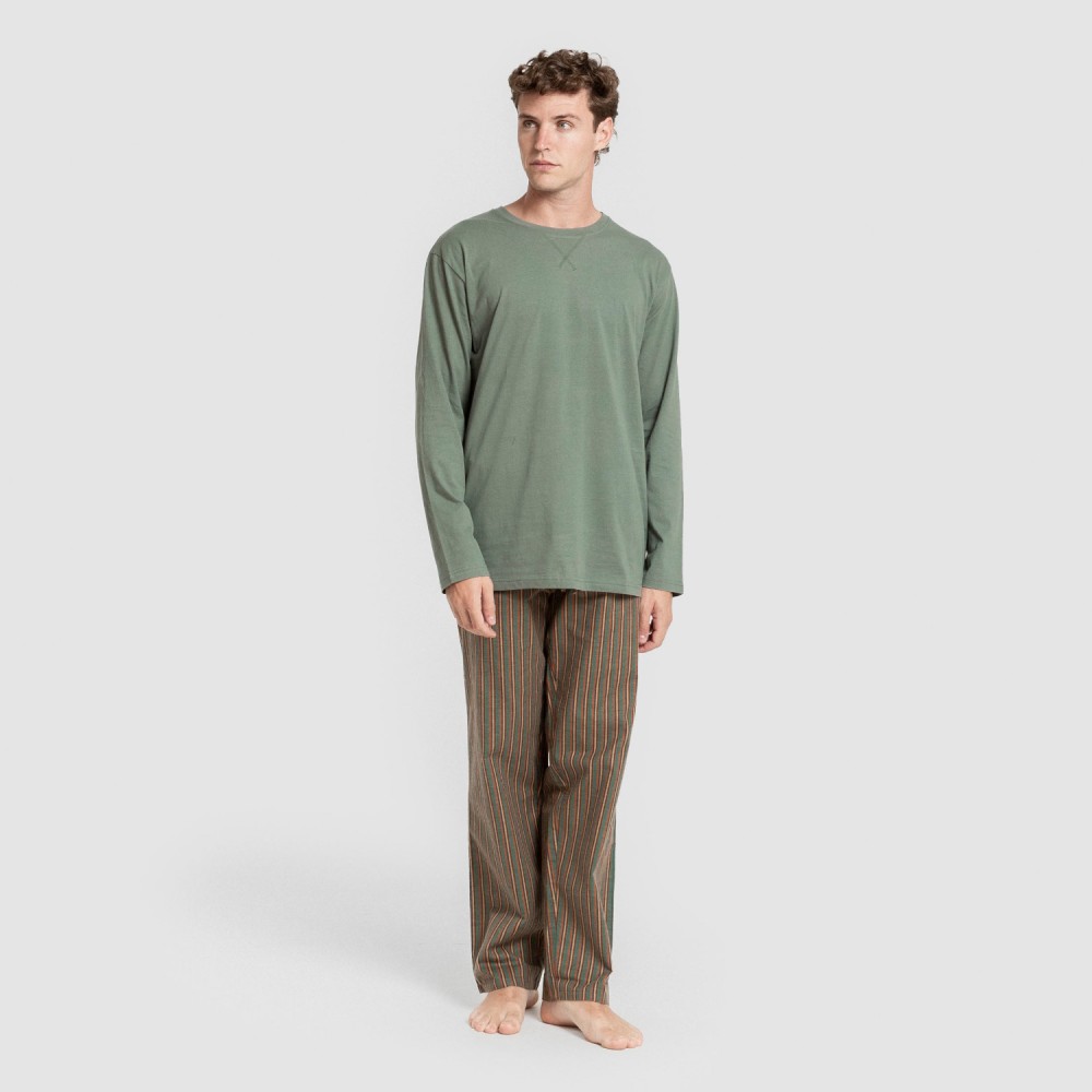 Camiseta lisa de color verde y pantalón del mismo tono con rayas marrones. El pantalón del pijama tiene la cintura elástica recubierta con una cinta para ajustar.