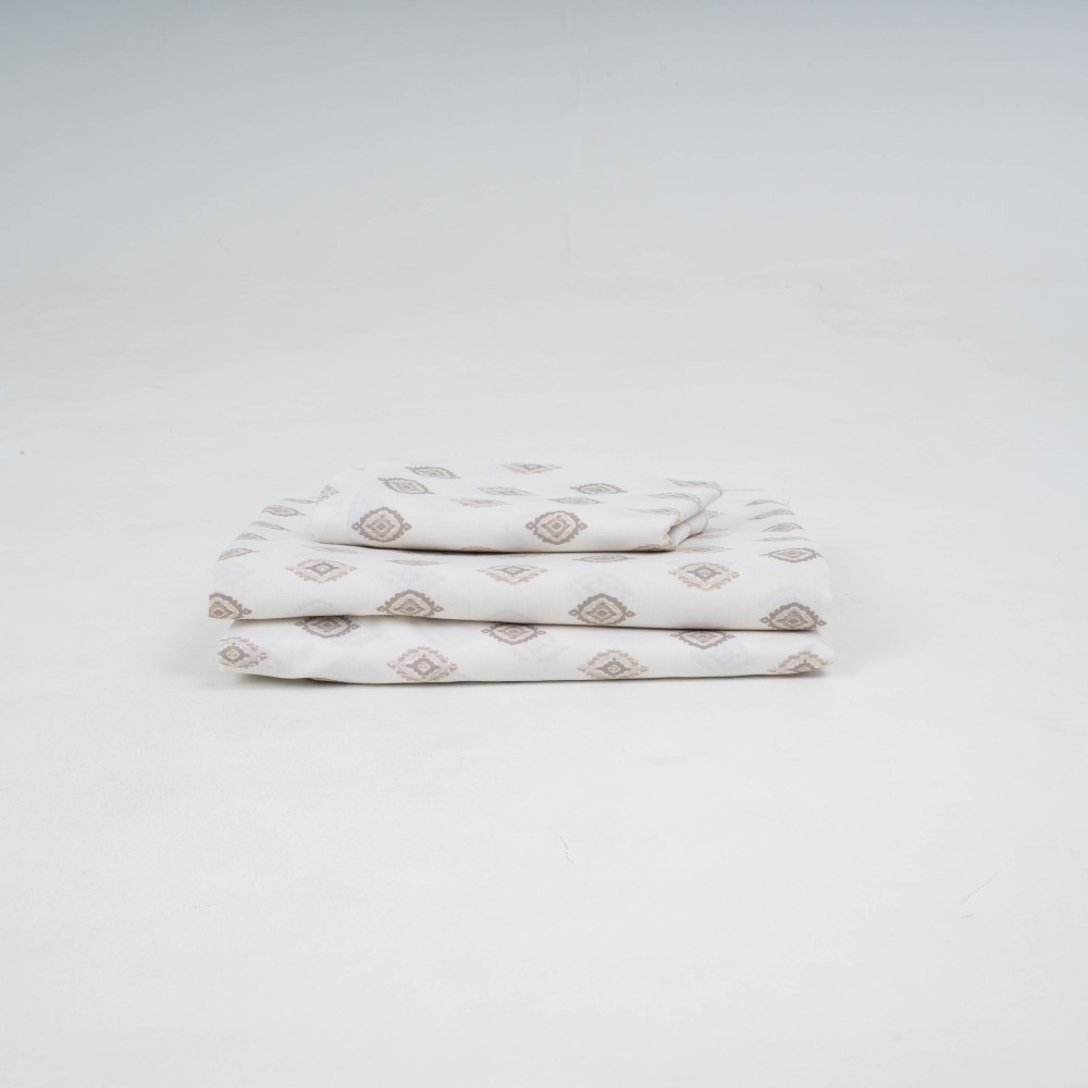 - Cama 200: 1 sábana encimera: 290 x 270 cm, 1 sábana bajera: 200 x 200 + 25 cm y 2 fundas de almohada: 110 x 45 cm