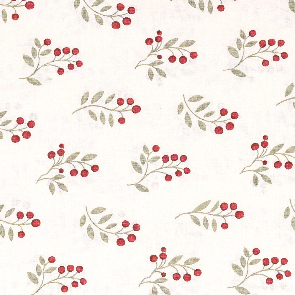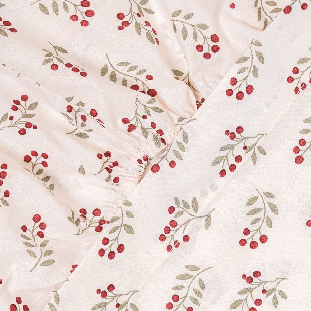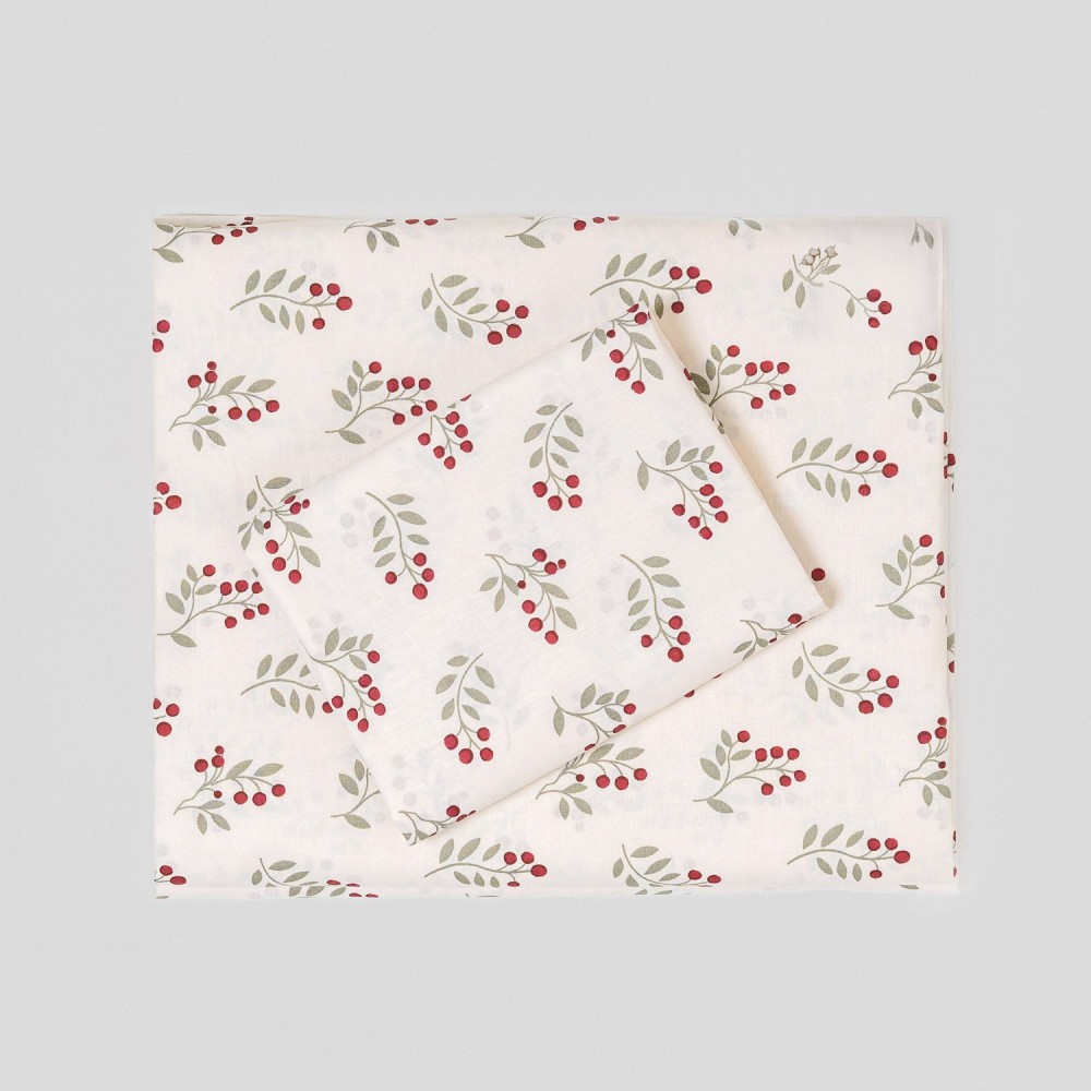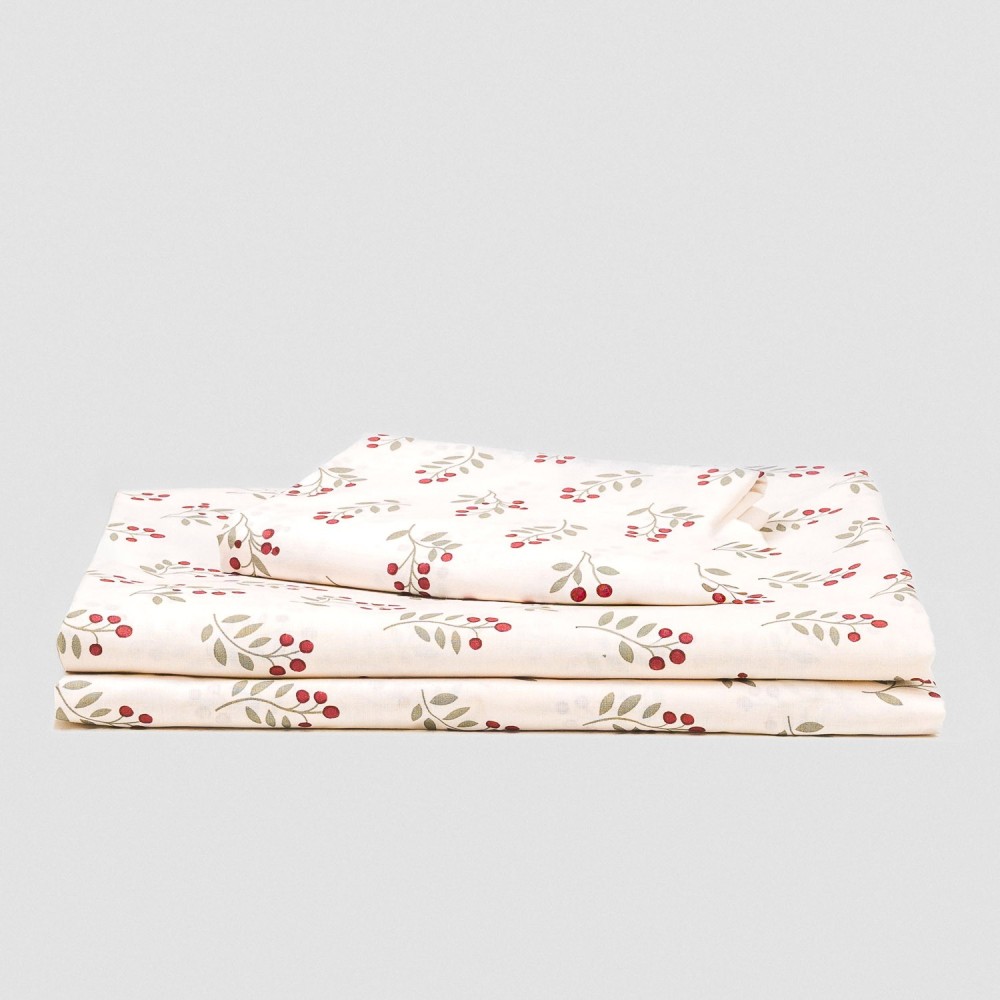 Sábanas y fundas de almohada blancas con flores de acebo en tonos rojos y verdes.