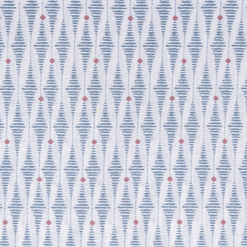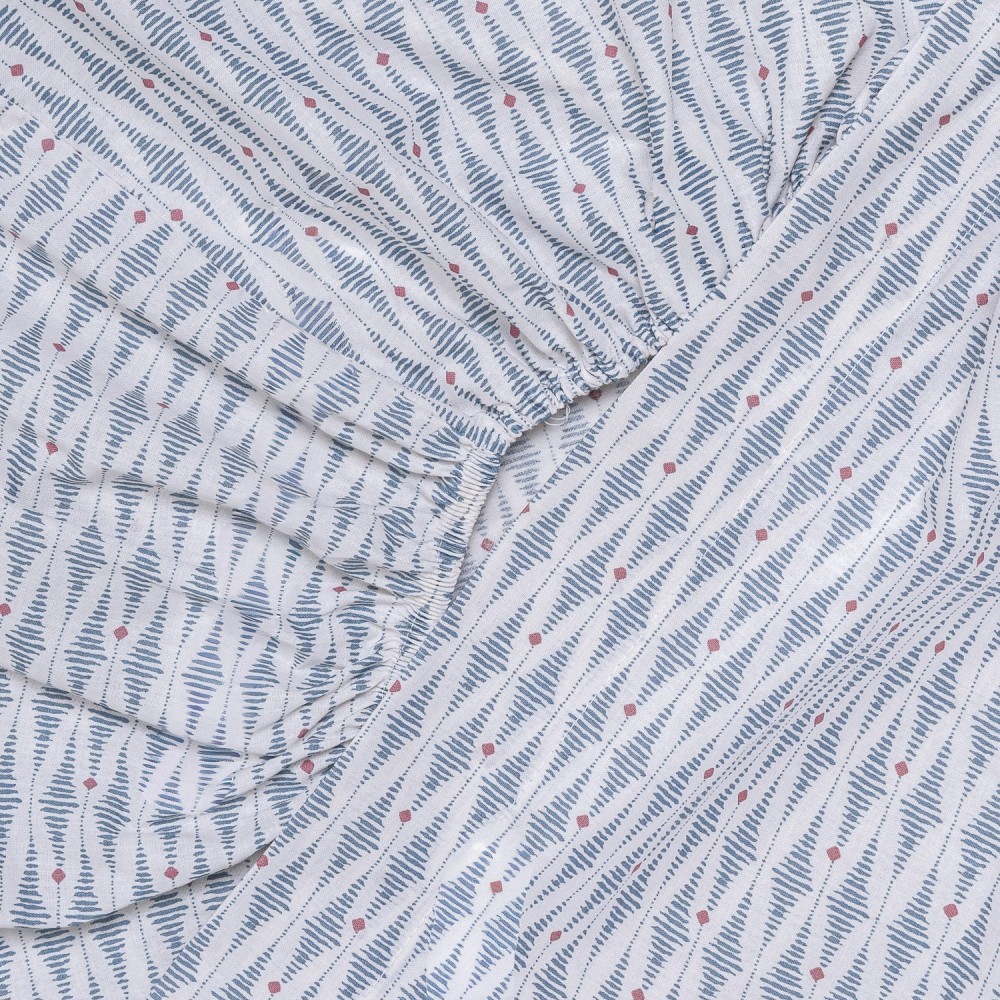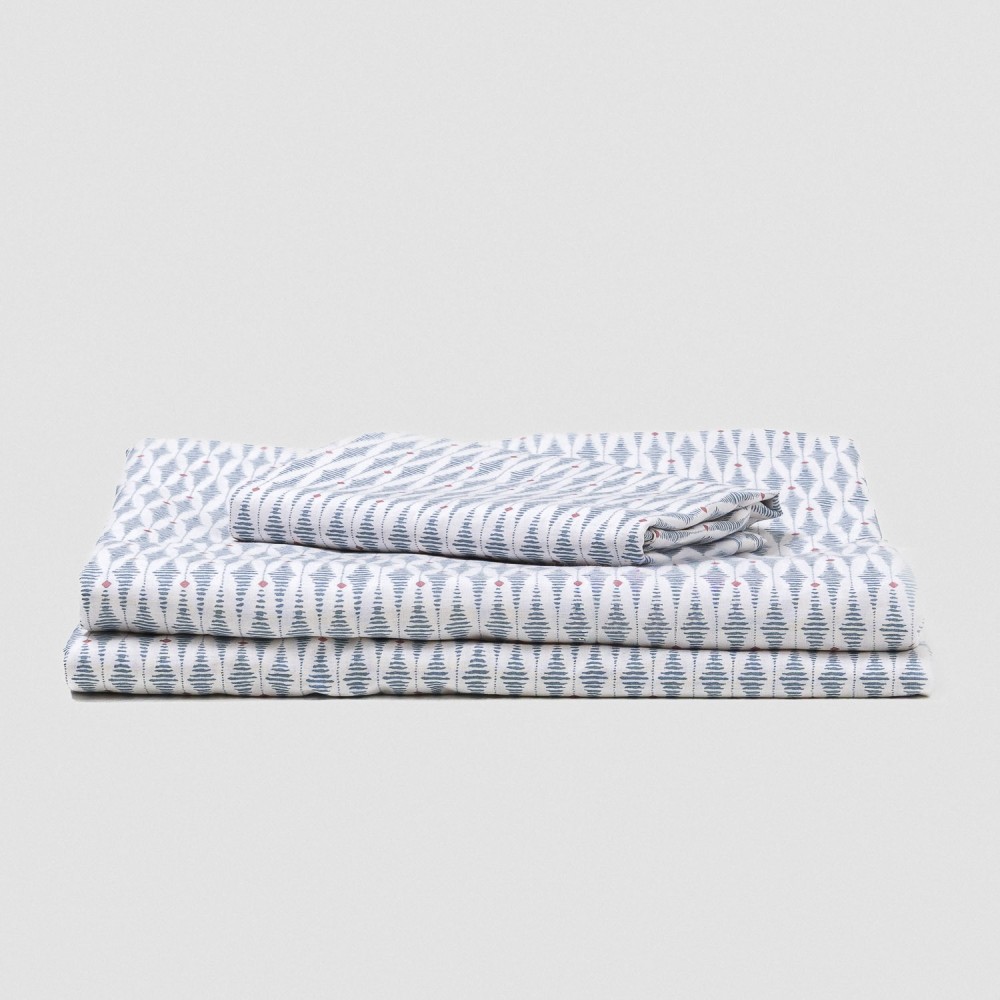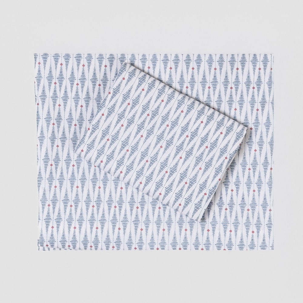 Sábanas y fundas de almohada en color blanco con estampado de diferentes rayas y rombos en tonos azules y rojos.