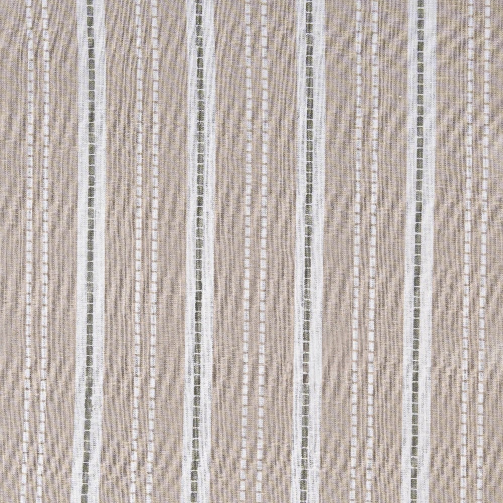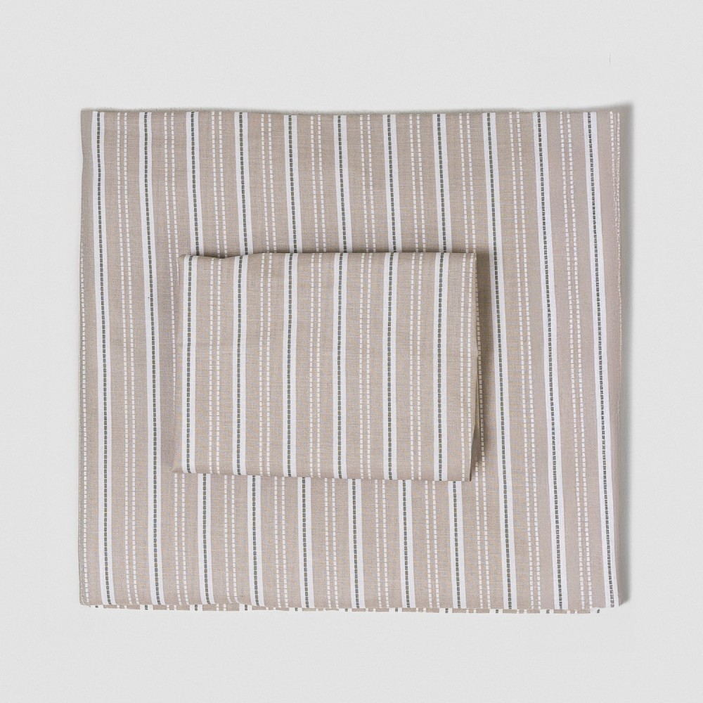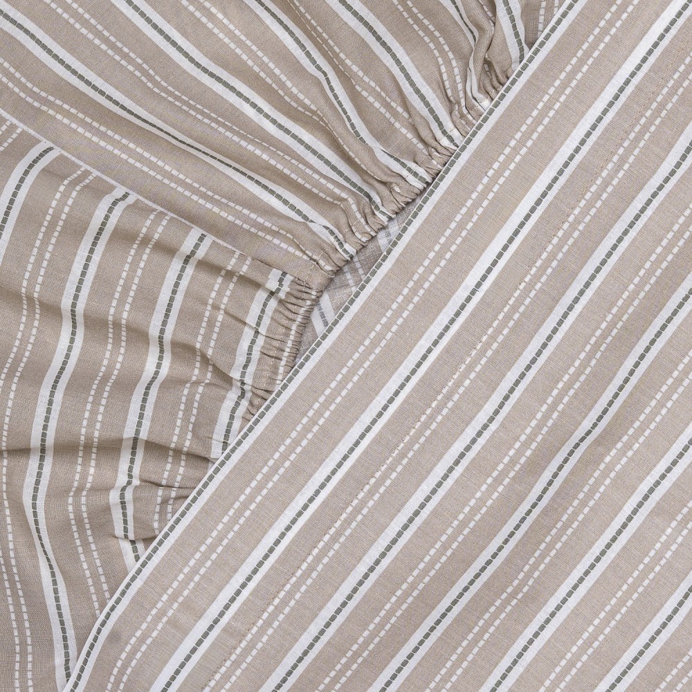Sábanas y fundas de almohada en color arena con diferentes rayas blancas y verdes.