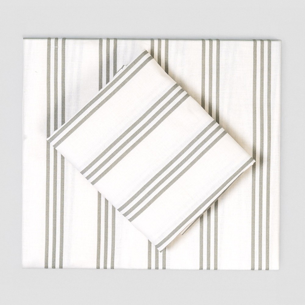 Sábanas y fundas de almohada blancas con rayas verdes.