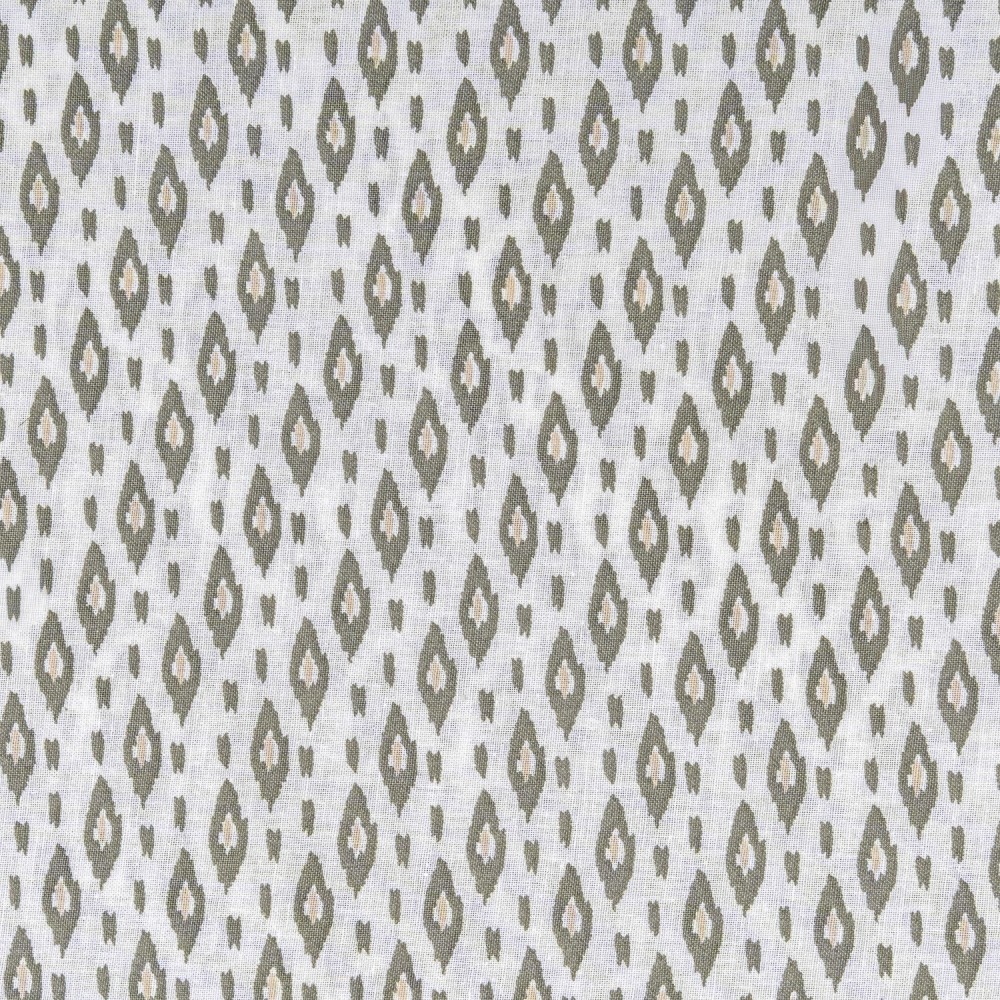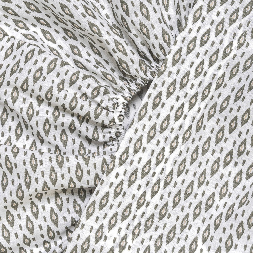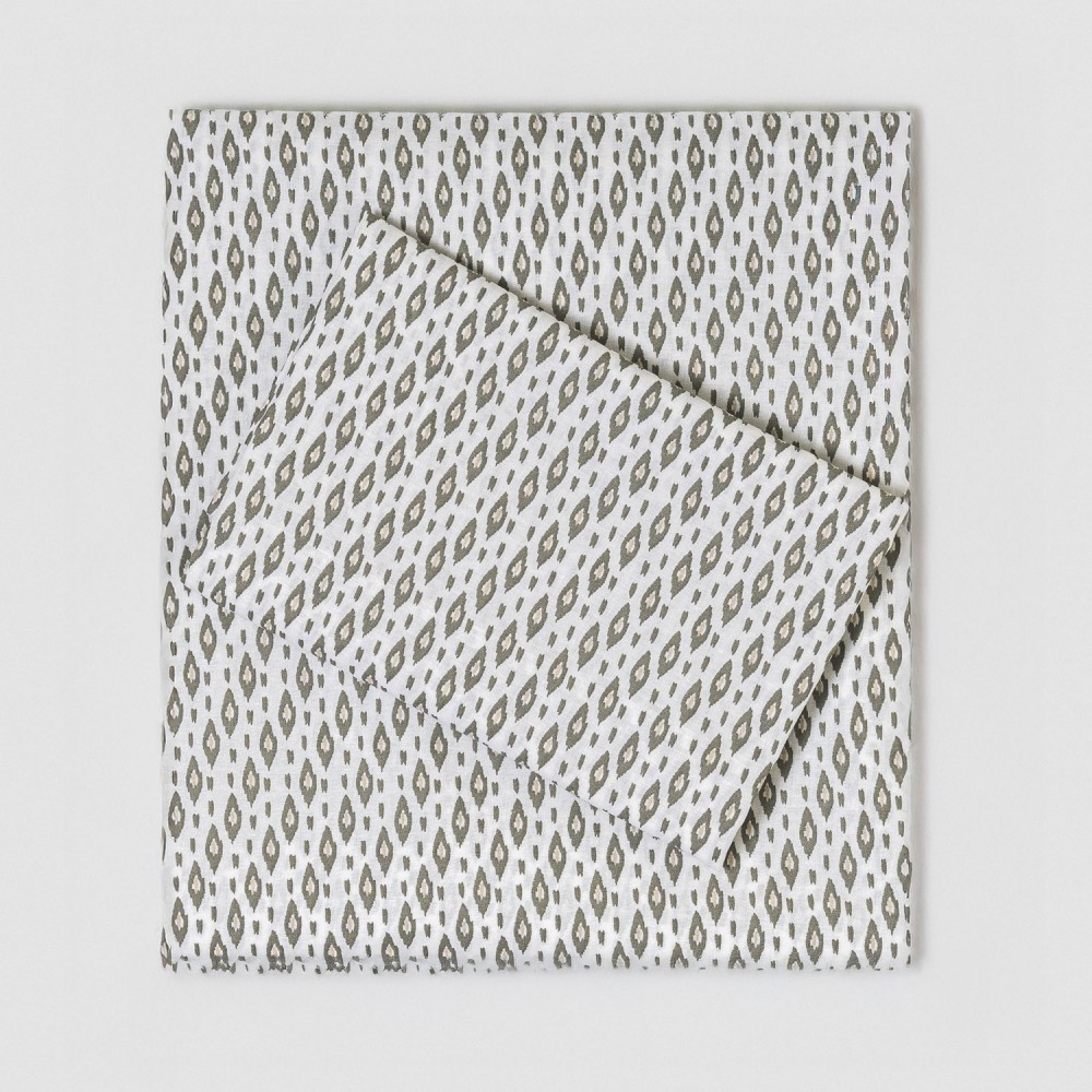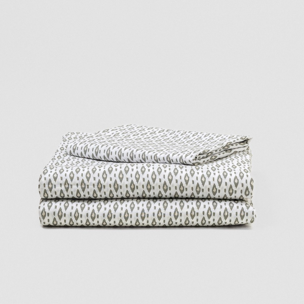 Sábanas y fundas de almohada blancas con estampado de pequeñas figuras geométricas en tonos verdes y beiges.