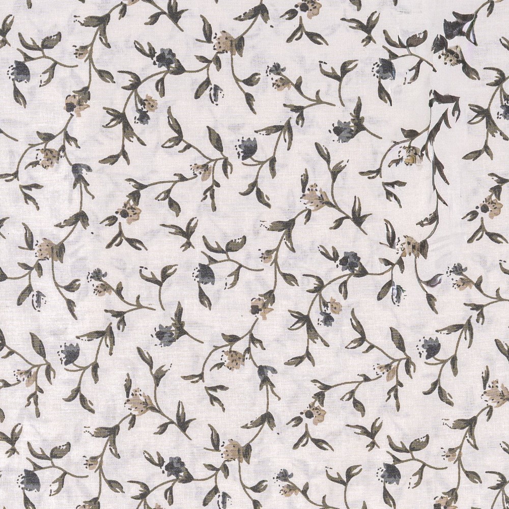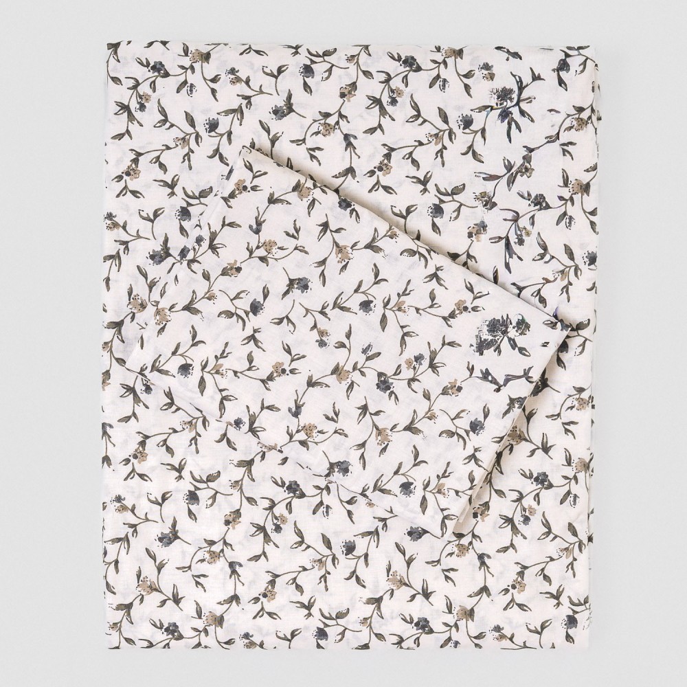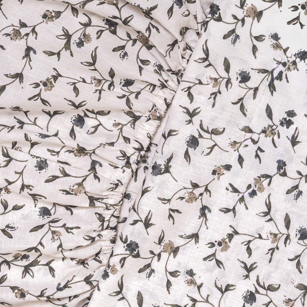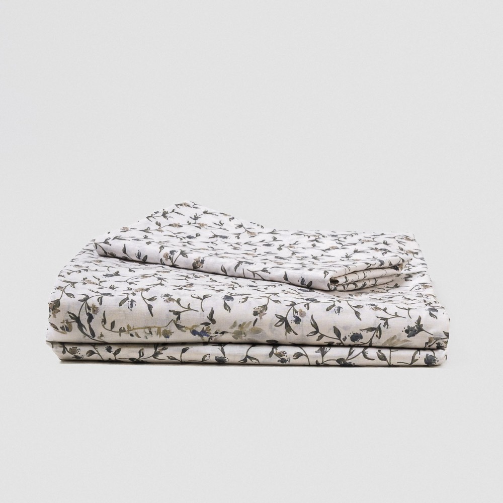 Sábanas y fundas de almohada blancas con estampado de pequeñas flores en tonos verdes y beiges.