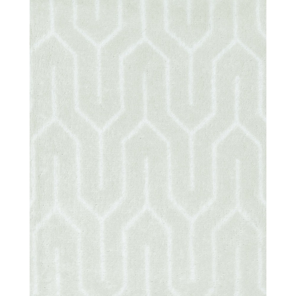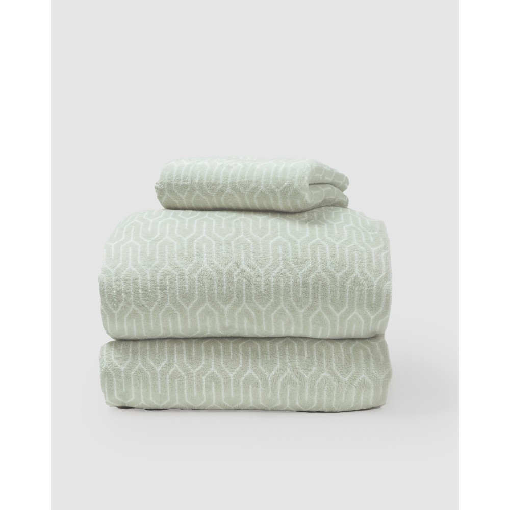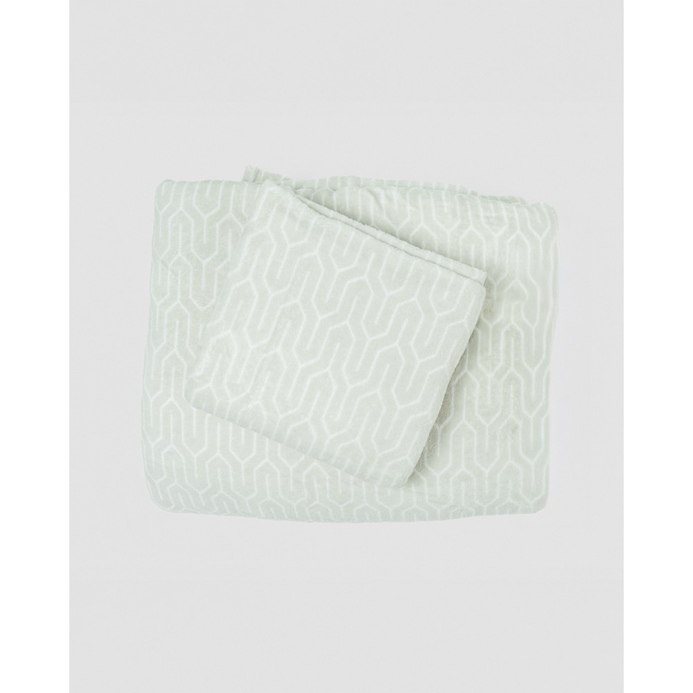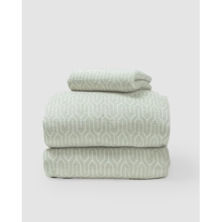 Sábanas y fundas de almohada con estampado geométrico de color blanco sobre un fondo verde.