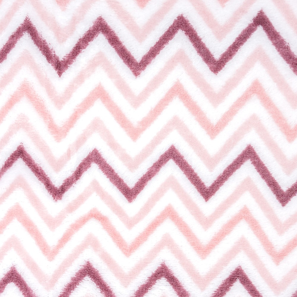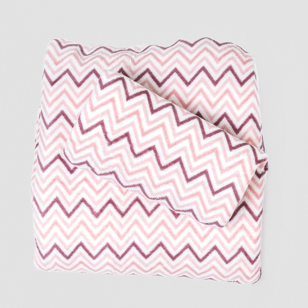 Sábanas y fundas de almohada con estampado de zigzags en diferentes tonos rosas sobre un fondo blanco.