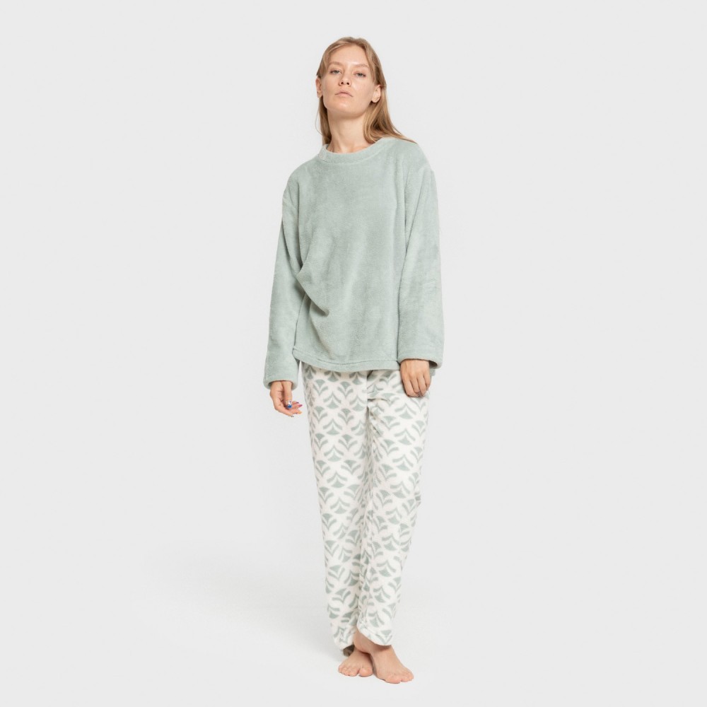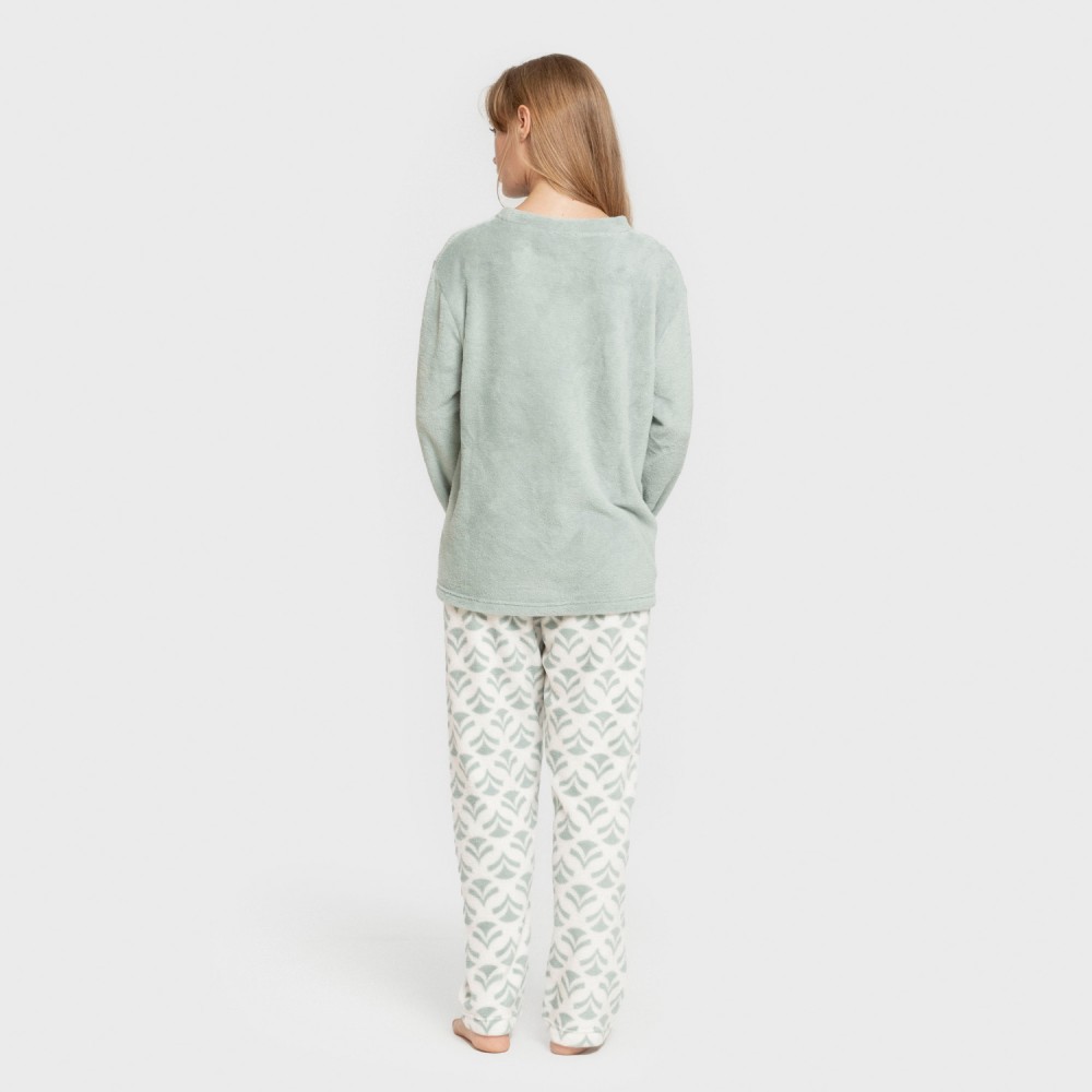 El pijama incluye una camiseta verde tiffany lisa, y un pantalón blanco con diferentes figuras verdes.