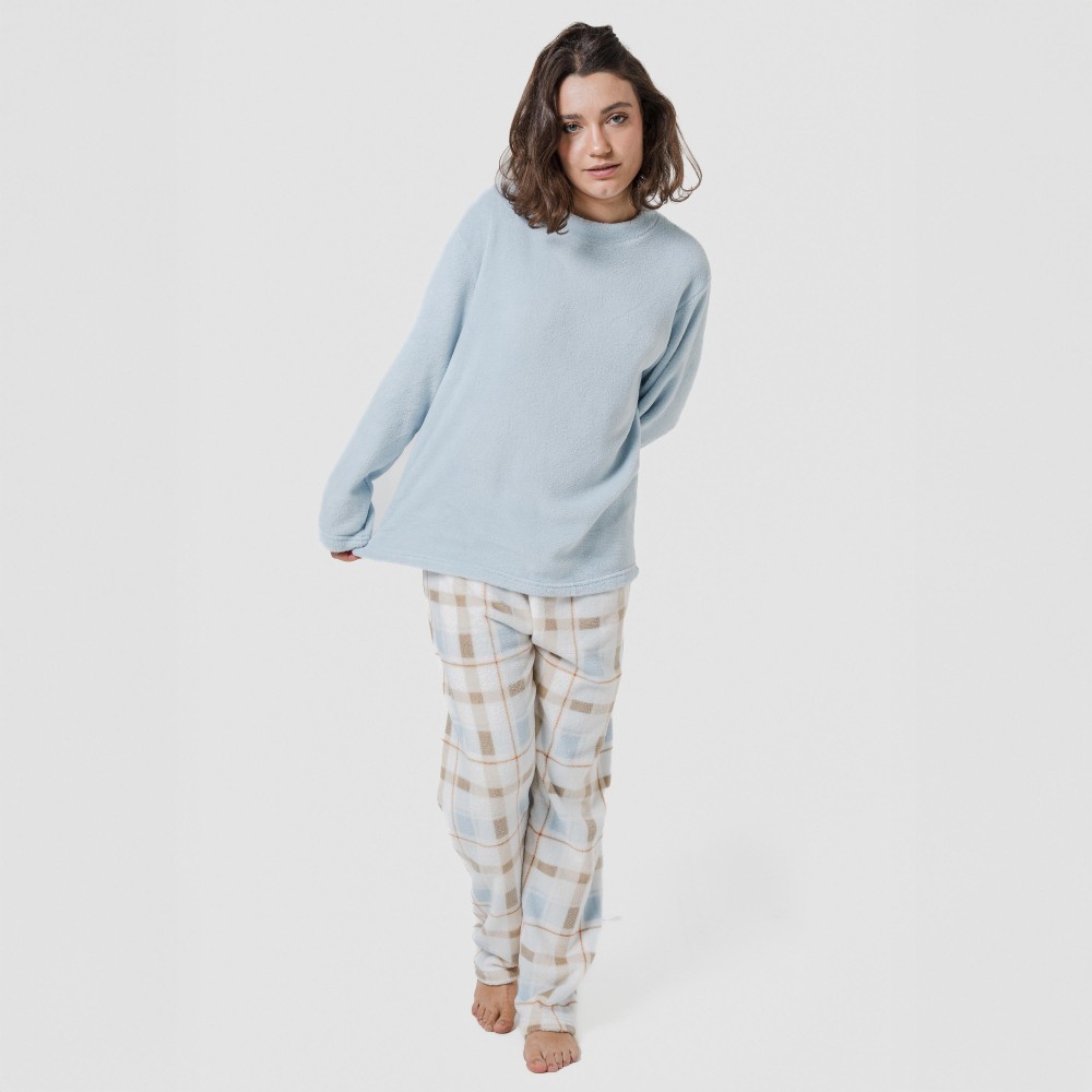 El pijama incluye una camiseta lisa en color azul, y un pantalón blanco de cuadros marrones y azules.