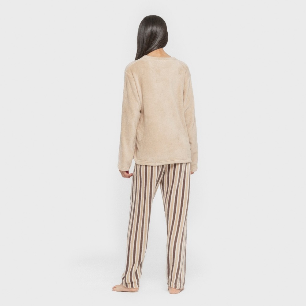 El pijama incluye una camiseta lisa en color arena, y un pantalón blanco de rayas en diferentes tonos marrones.