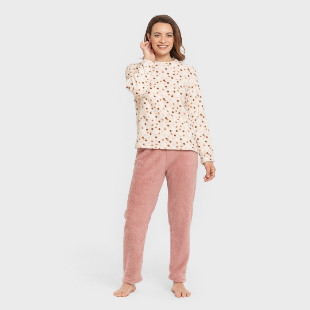 El pijama incluye una camiseta blanca con estampado de lunares marrones y rosas, y un pantalón liso de color malva.