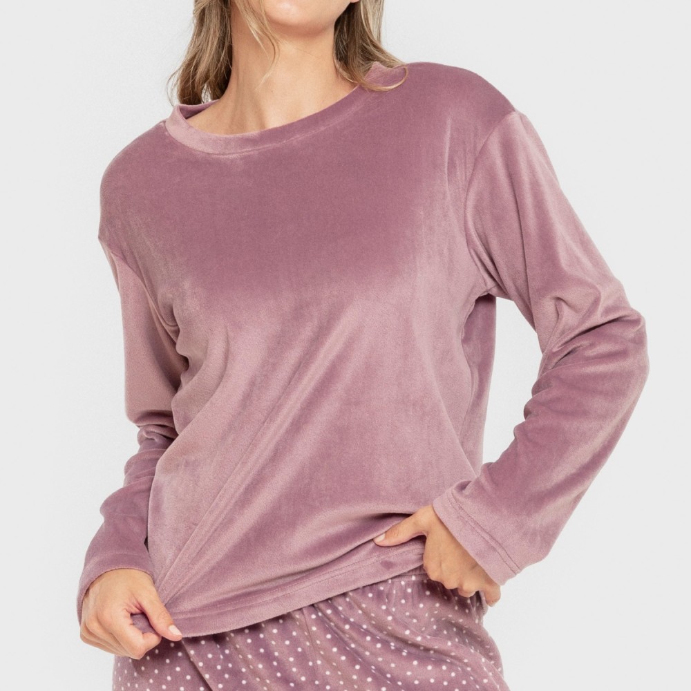 El pijama incluye una camiseta de color malva y un pantalón del mismo tono con pequeños lunares blancos.