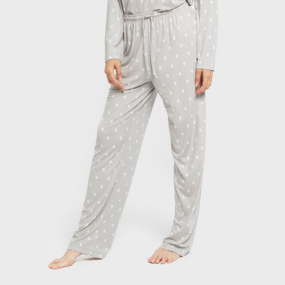 El pijama se conforma de una camiseta y un pantalón en color gris con estampado de flores blancas. El pantalón del pijama tiene la cintura elástica y un cordón para que se ajuste mejor al cuerpo.