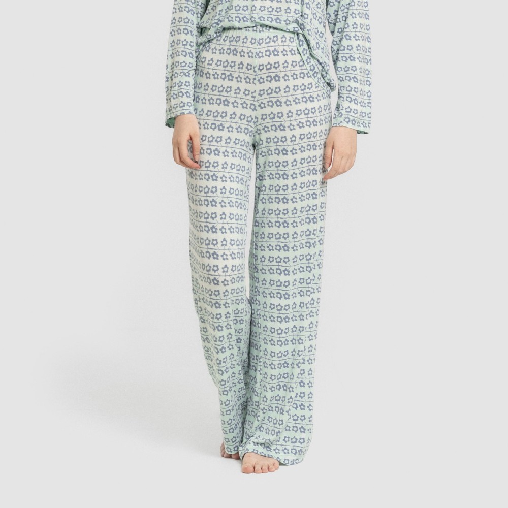 La camiseta y el pantalón son de color blanco con estampado de flores azules.