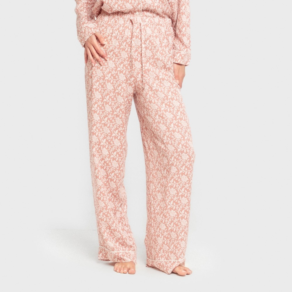 Cuenta con una camiseta de botones con solapa y un pantalón largo fluido de color rosa con estampado de flores blancas.