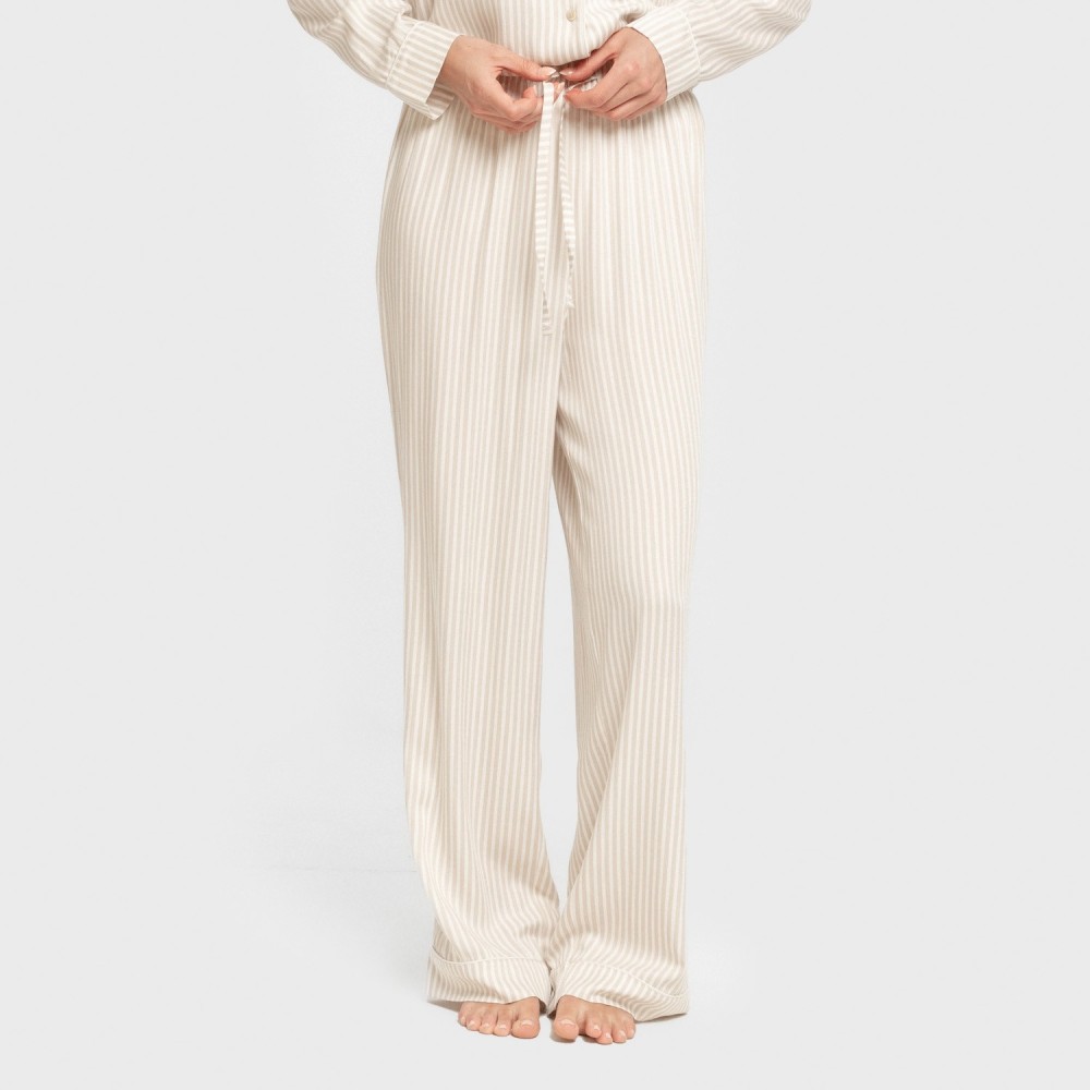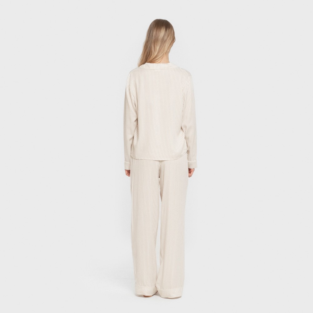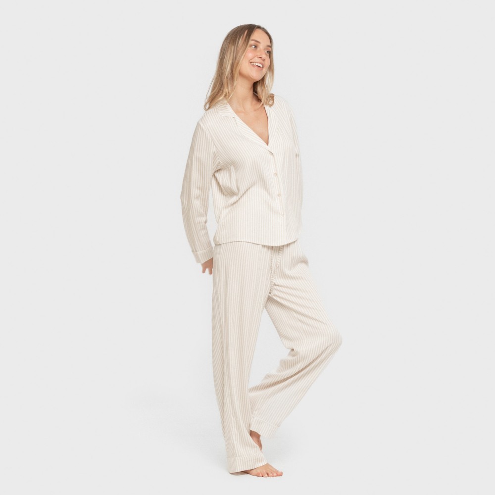 Cuenta con una camiseta de botones con solapa y un pantalón largo fluido de color blanco con rayas de color arena.