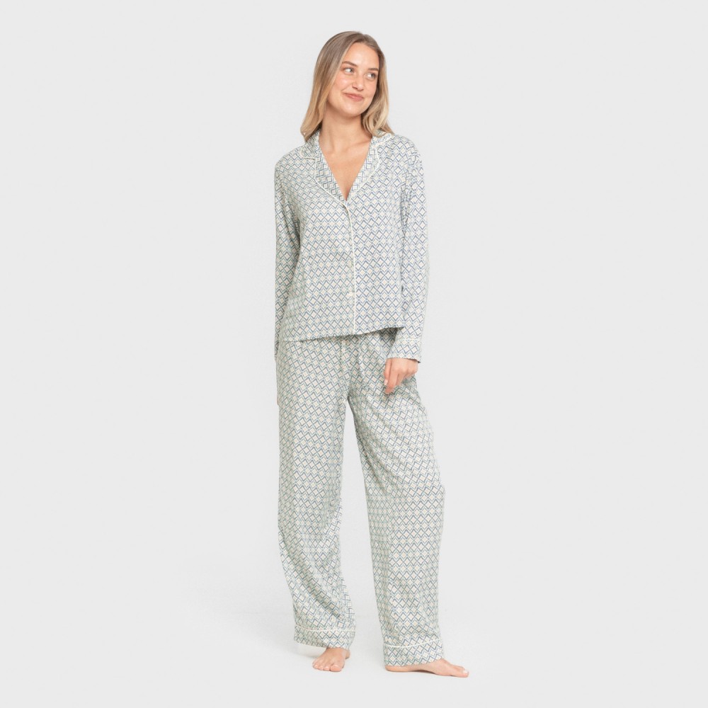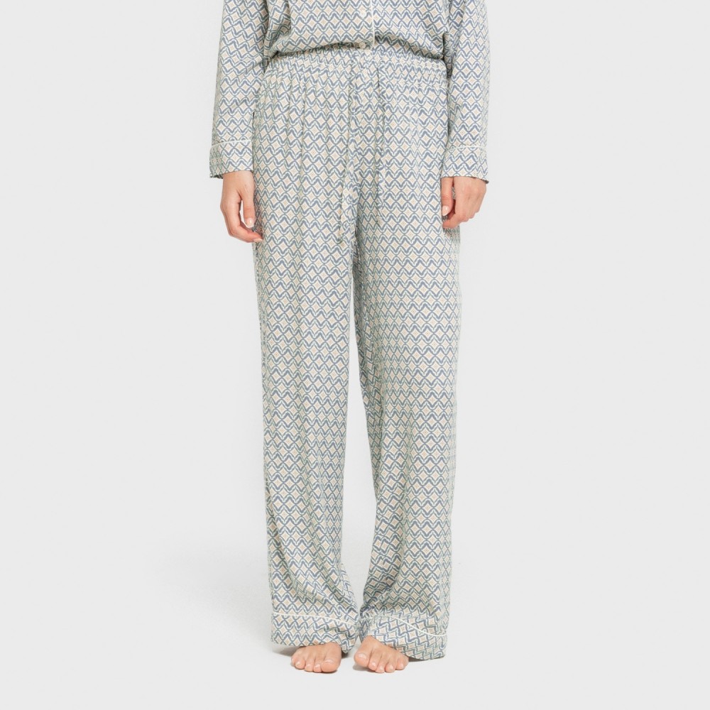 Cuenta con una camiseta de botones con solapa y un pantalón largo fluido de color blanco con estampado geométrico de color azul y arena.