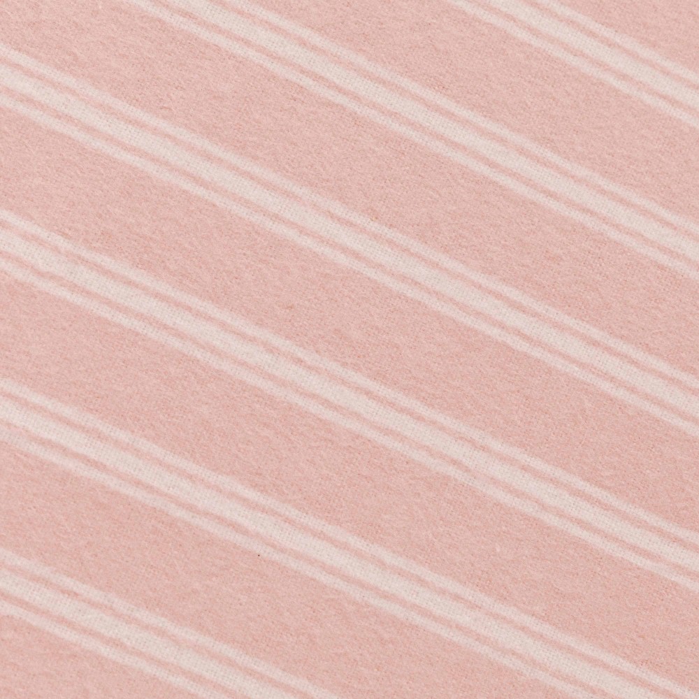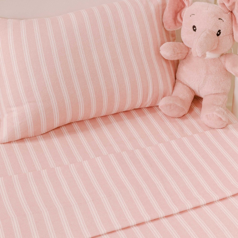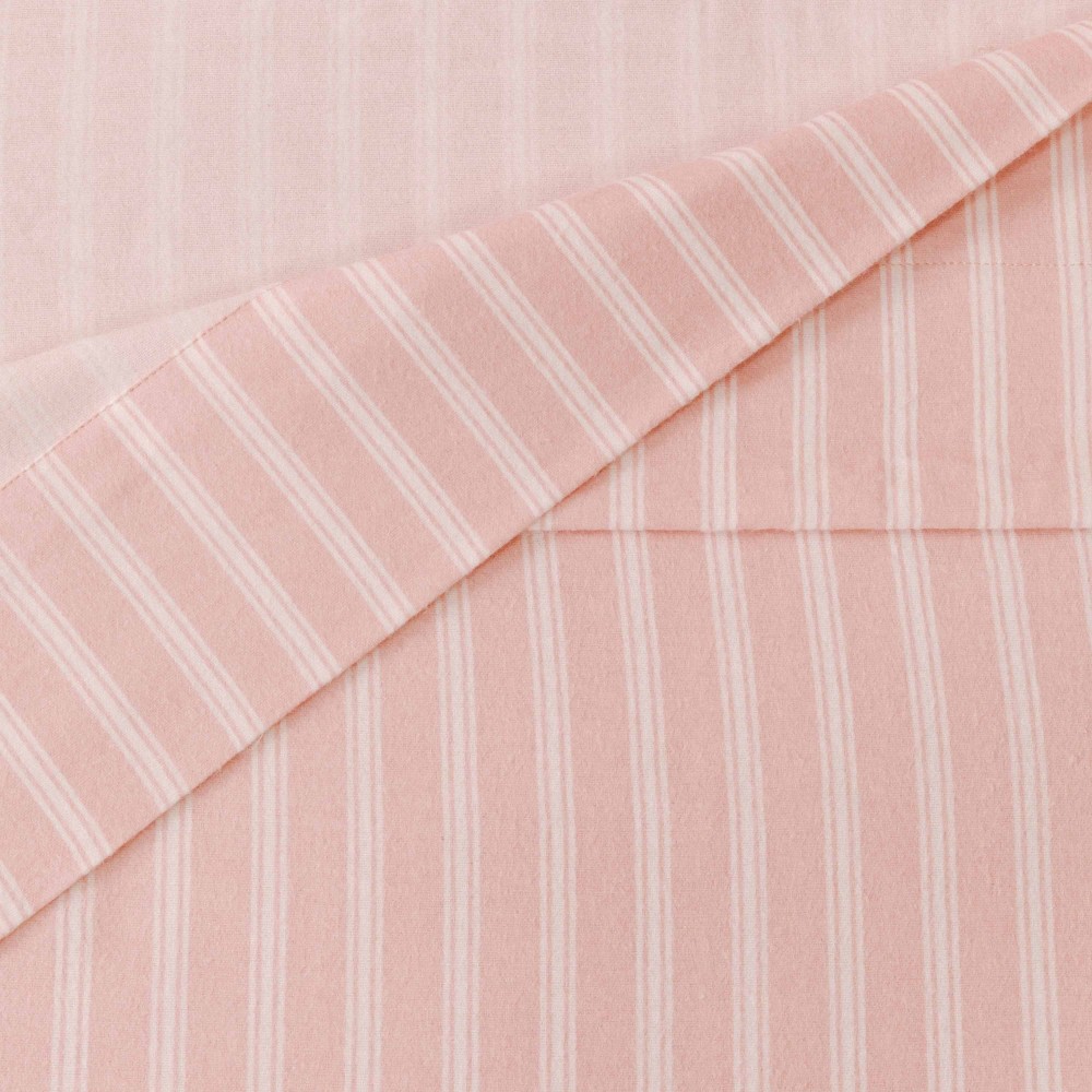 Sábanas y funda de almohada de color rosa con estampado de rayas blancas en tejido de franela muy suave, ideales para el invierno por sus características térmicas.