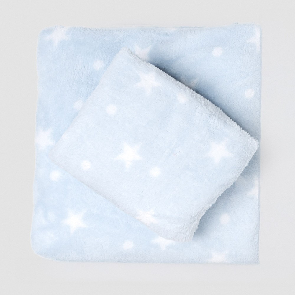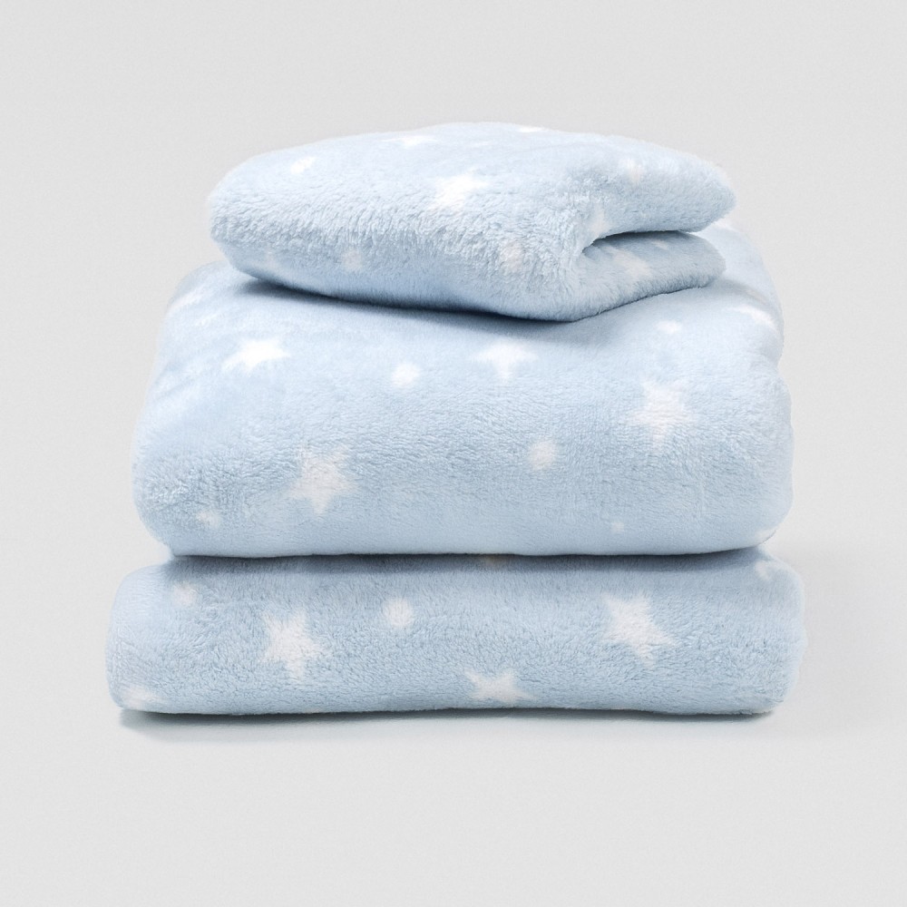 Sábanas y funda de almohada con estampado de estrellas blancas sobre un fondo azul.