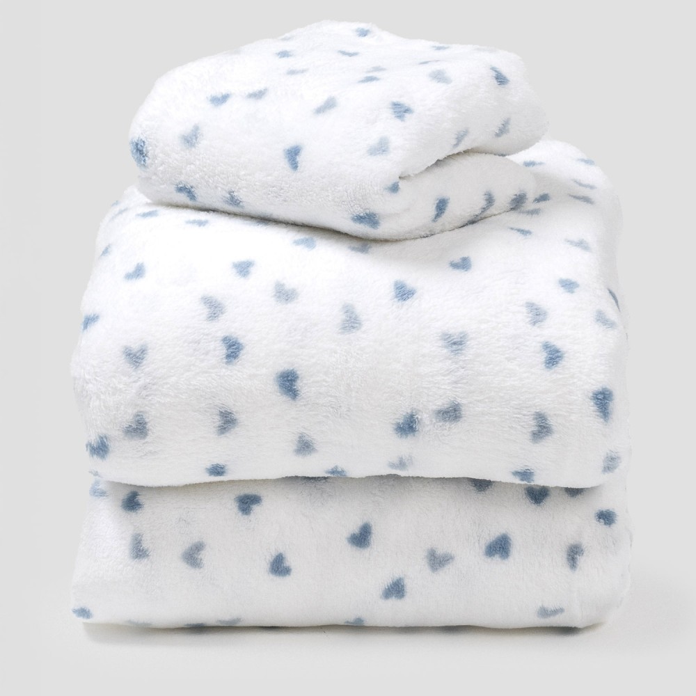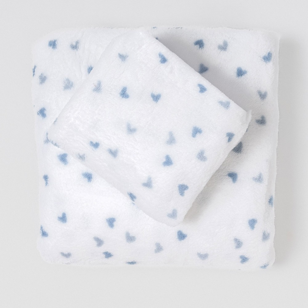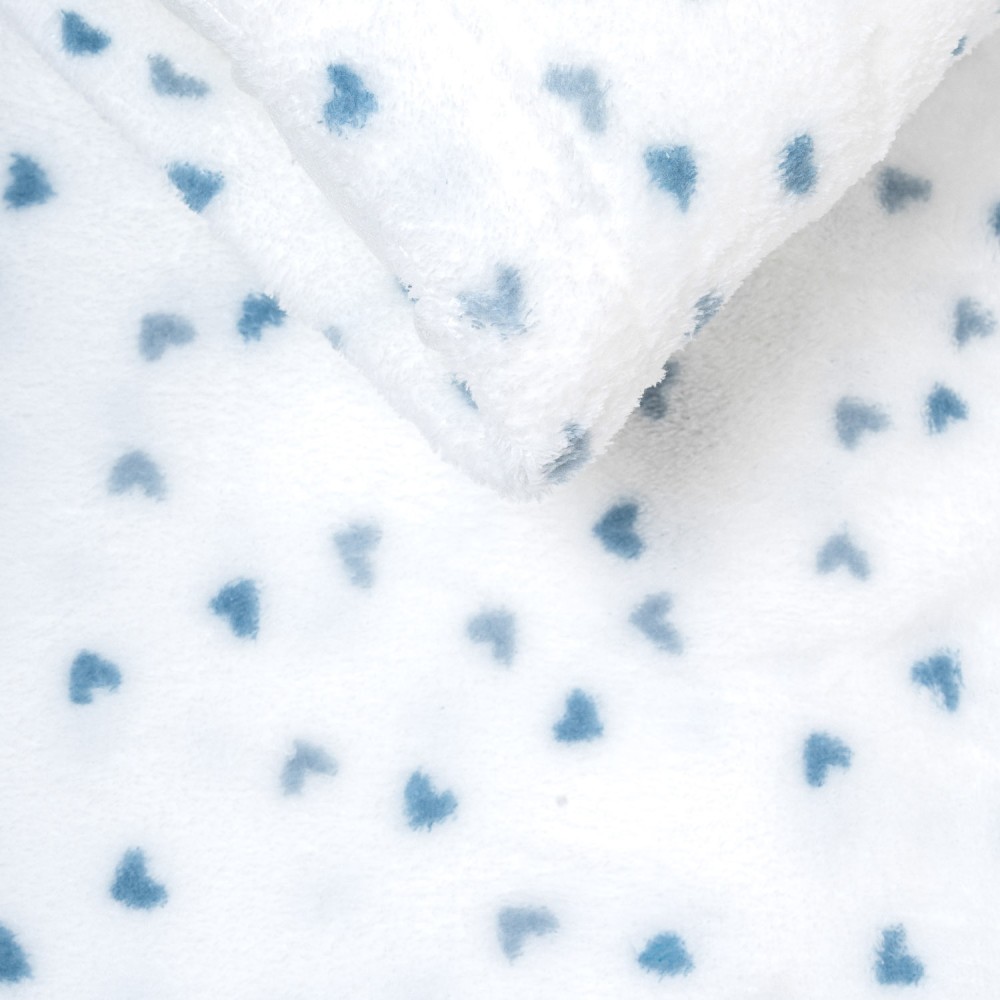 Sábanas y funda de almohada con estampado de corazones azules sobre un fondo blanco.