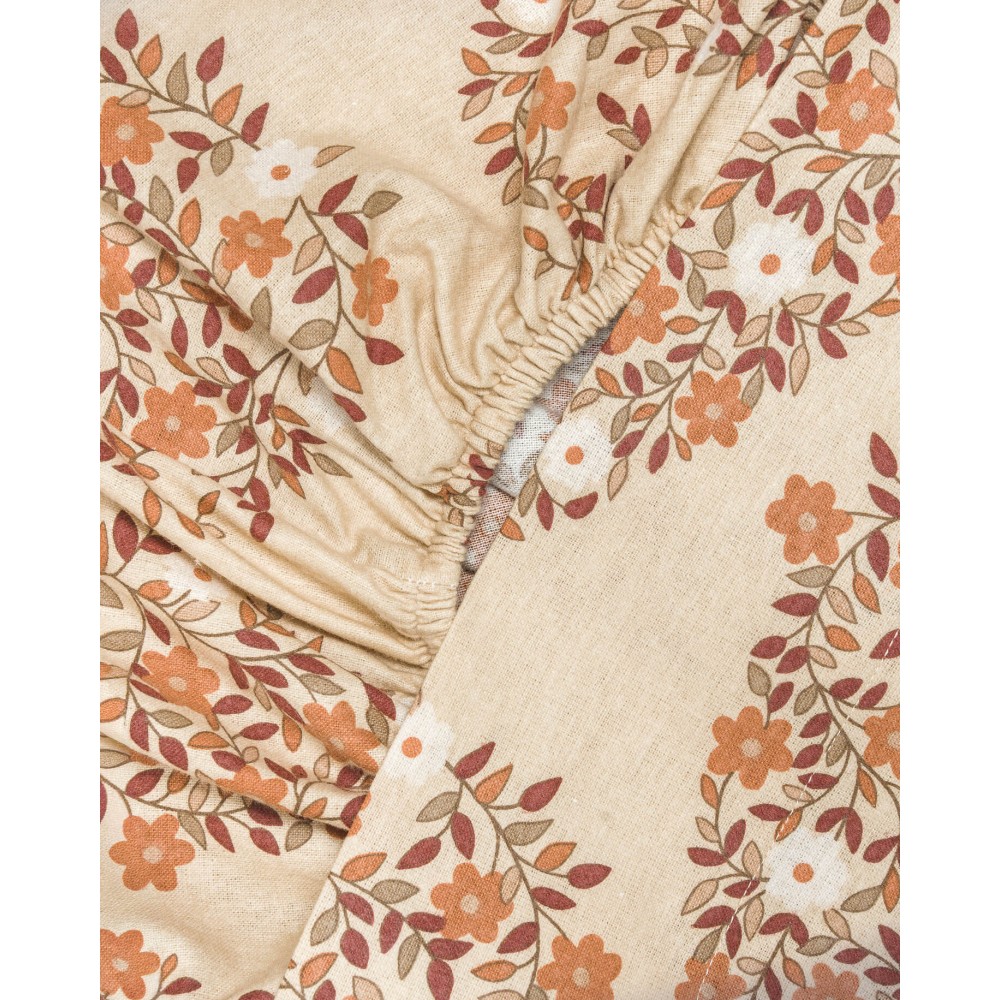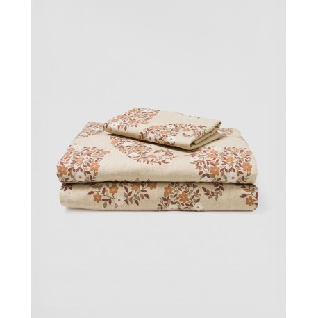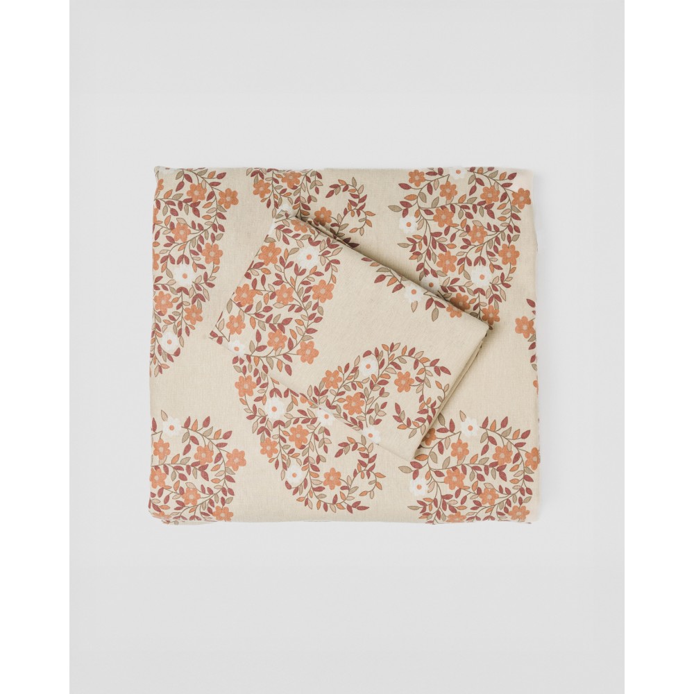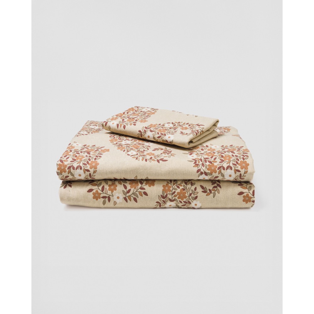 Sábanas y fundas de almohada de color arena con estampado cachemir de flores y hojas en tejido de franela muy suave, ideales para el invierno por sus características térmicas.