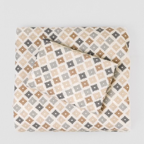 Sábanas y fundas de almohada de color natural con estampado geométrico en tonos azules y beiges en tejido de franela muy suave, ideales para el invierno por sus características térmicas.