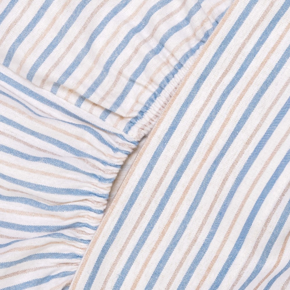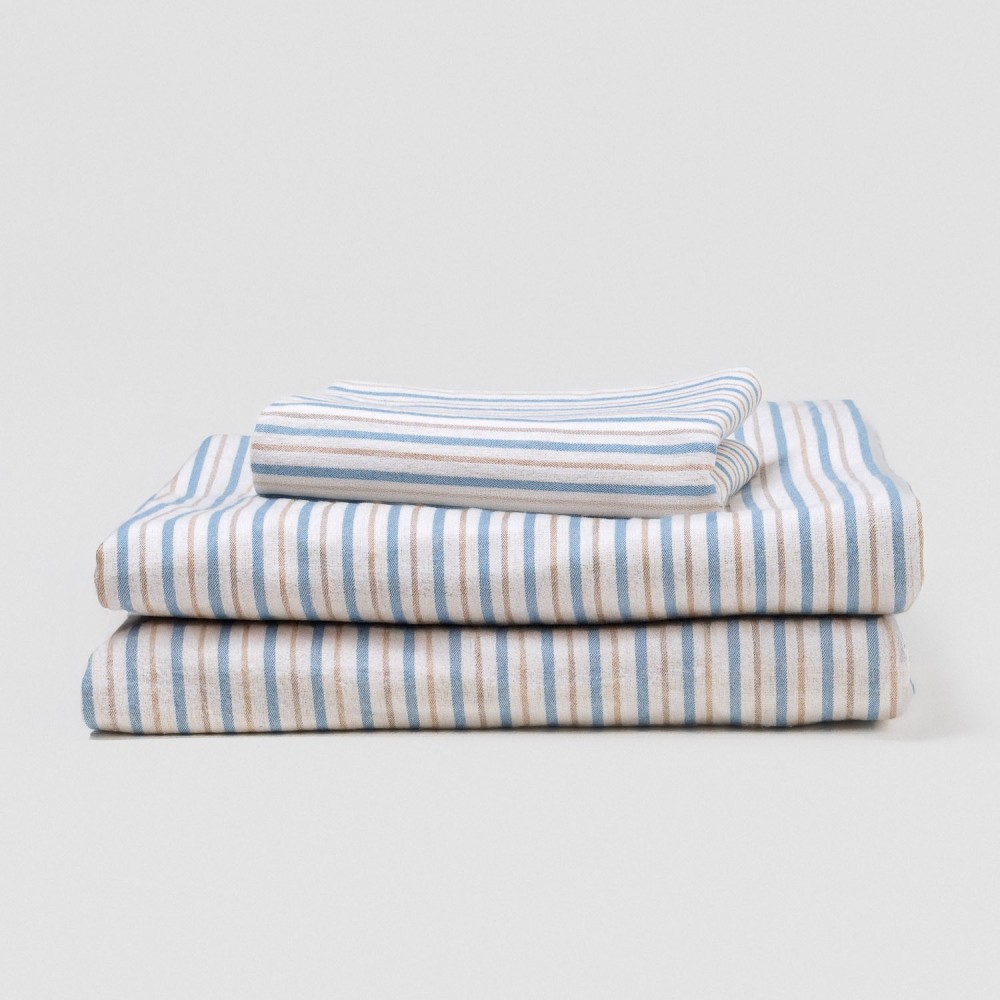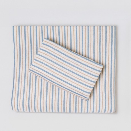Sábanas y fundas de almohada de color blanco con rayas azules y beiges en tejido de franela muy suave, ideales para el invierno por sus características térmicas.