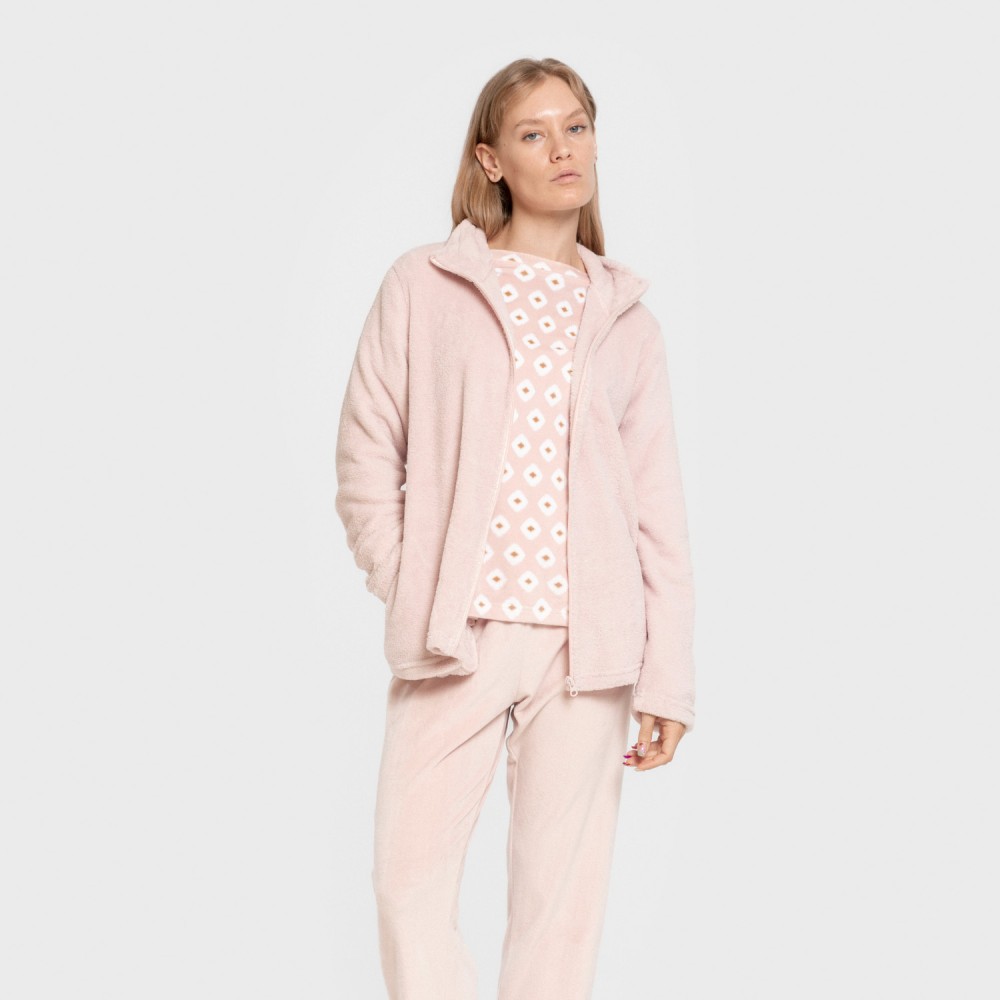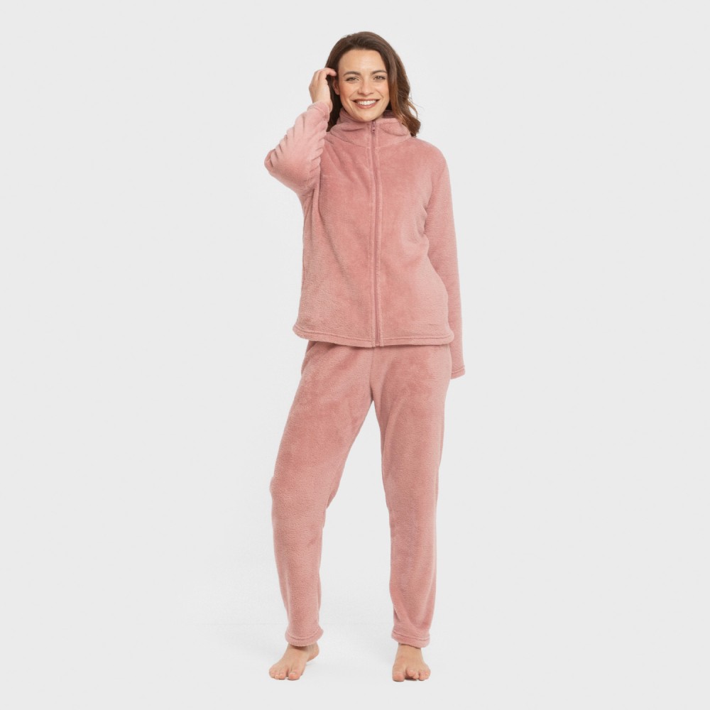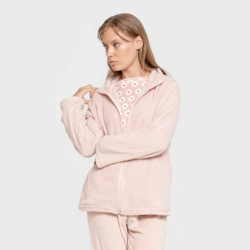 Confeccionada en color liso con bolsillos laterales y cremallera, su tejido coral es suave y además es aislante de la humedad.