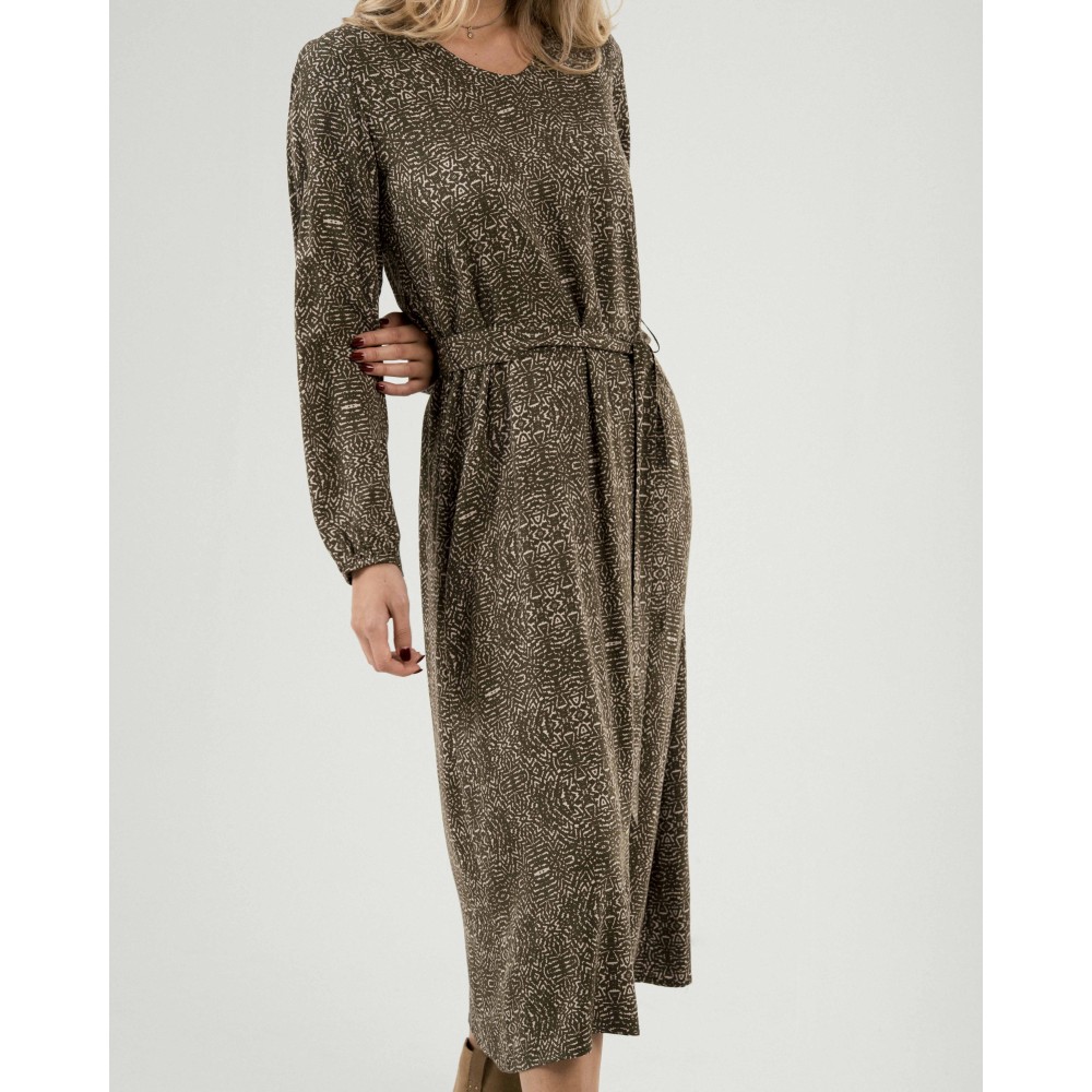 Vestido de corte midi con manga larga, cuello de pico y cintura ajustable con lazo.