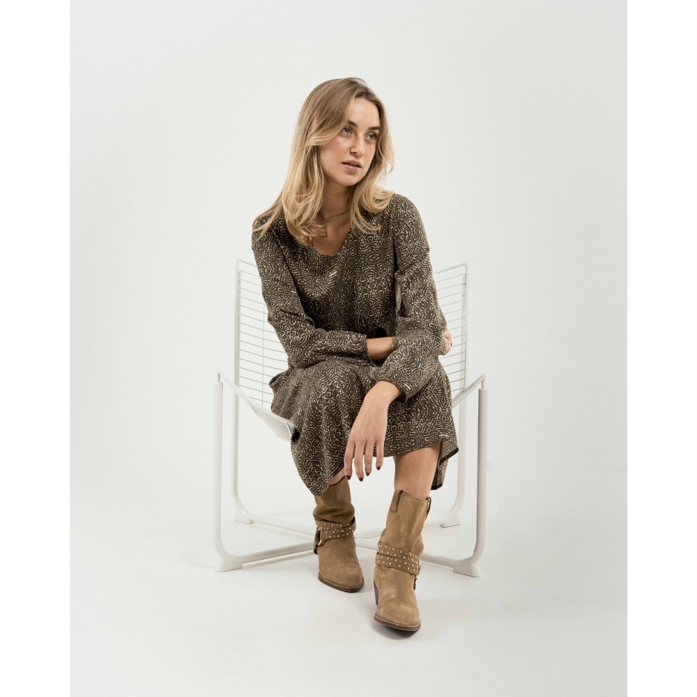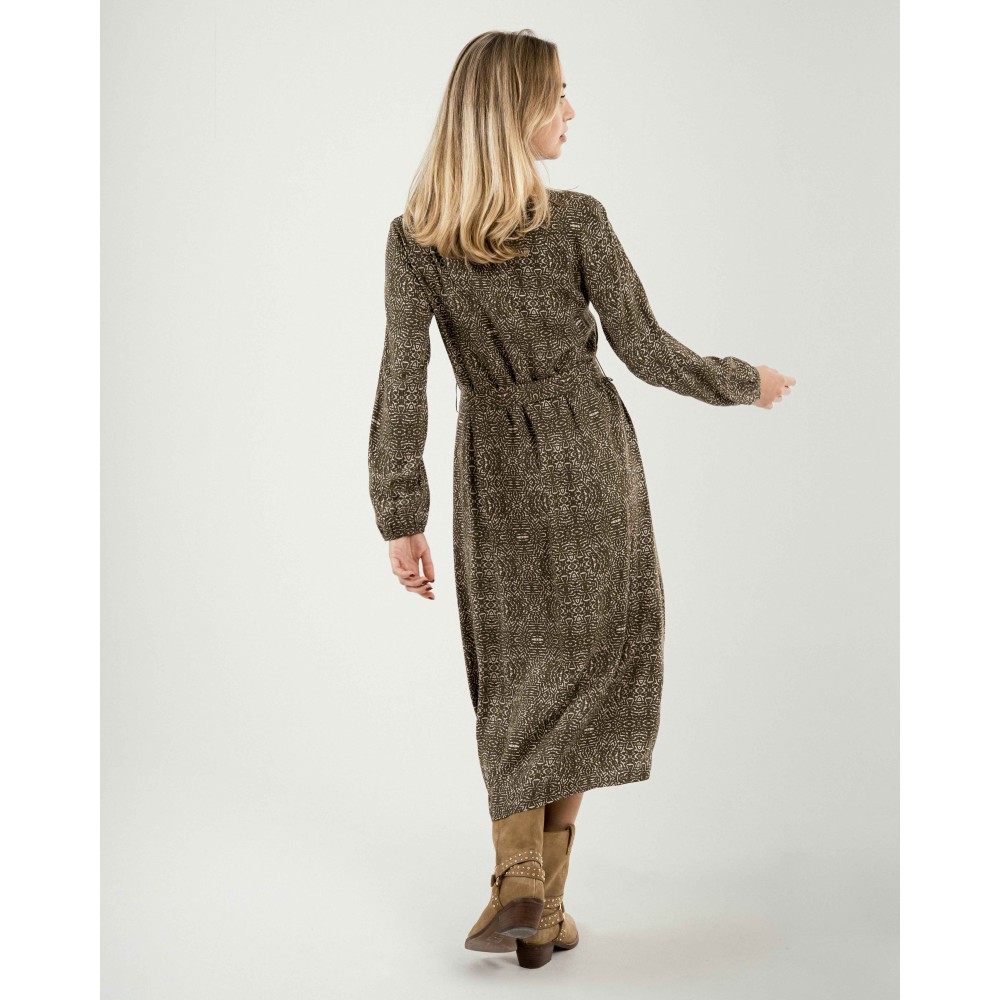 Vestido midi manga larga pico viscosa Dalias verde cacería