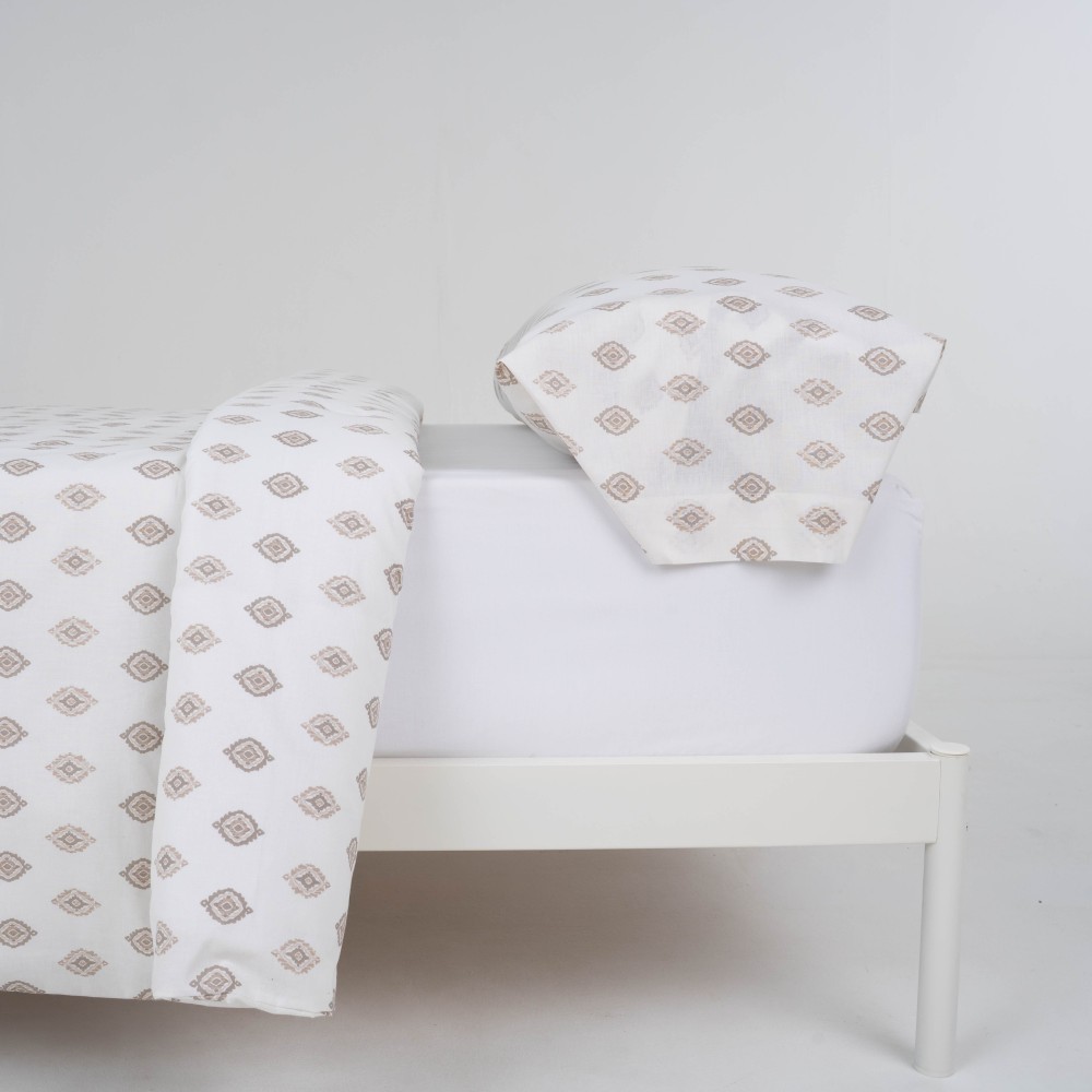 Funda de almohada y funda nórdica con discreto estampado de figuras geométricas grises y beiges sobre un fondo blanco.