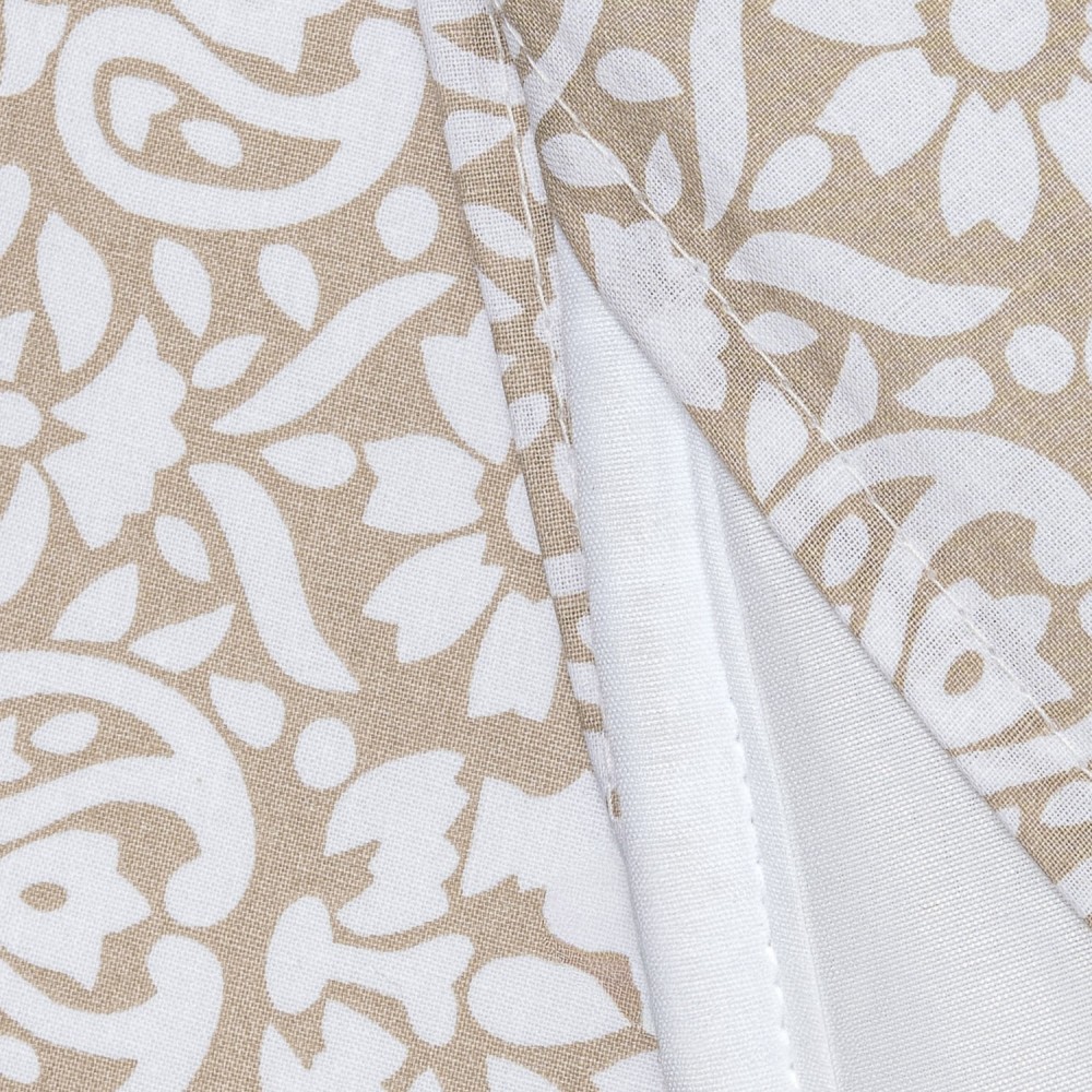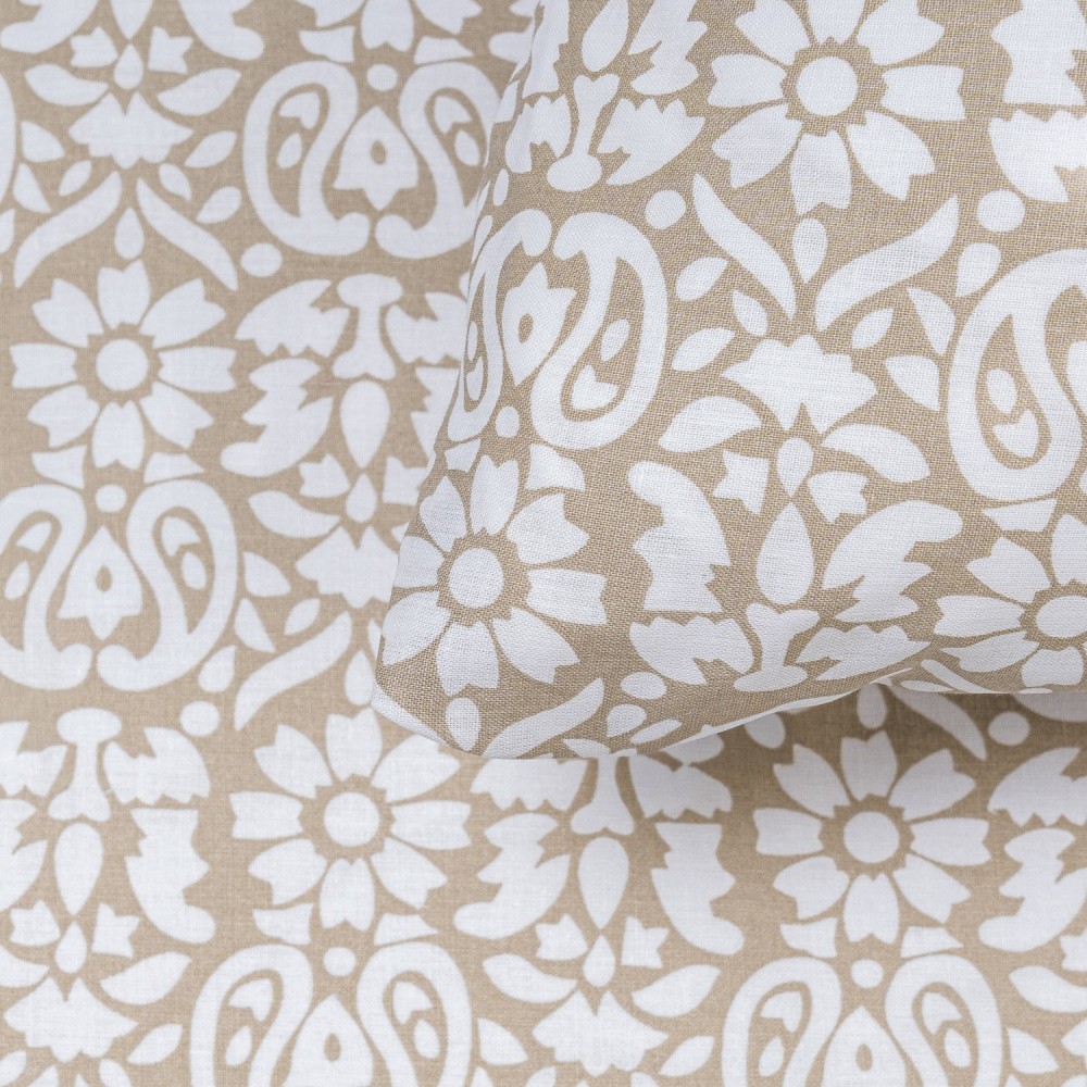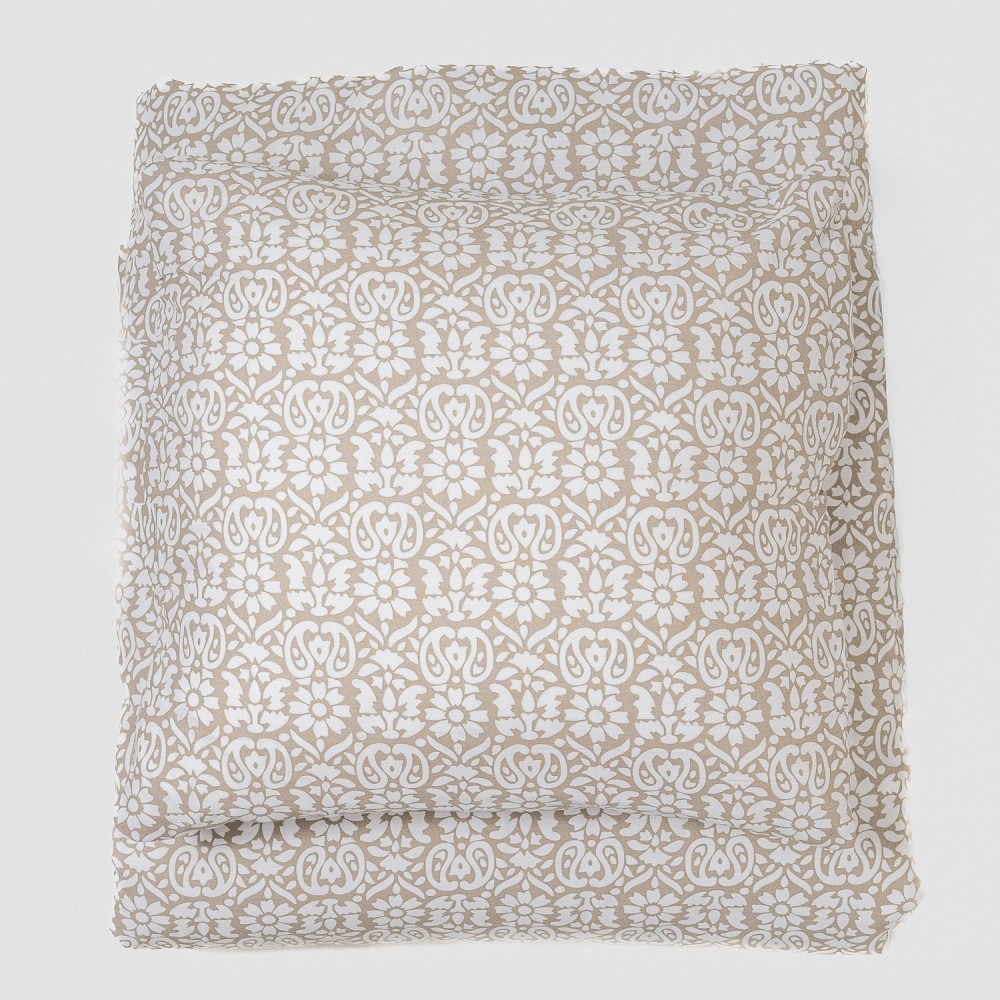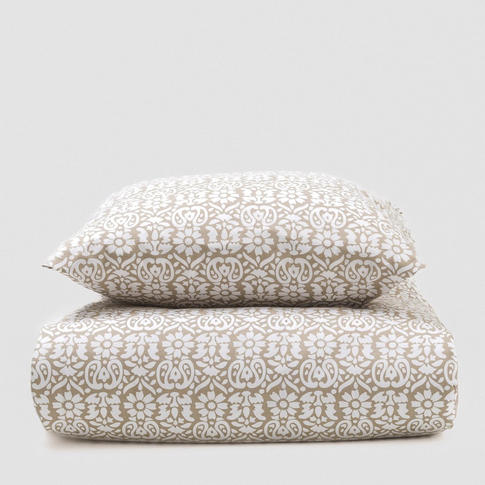 Fundas de almohada y funda nórdica en color arena con estampado de flores blancas.
