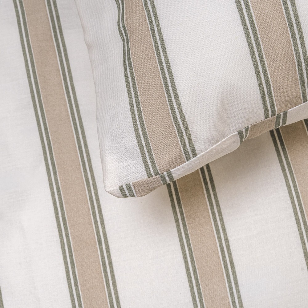 Fundas de almohada y funda nórdica en color blanco con estampado de rayas verde y arena.