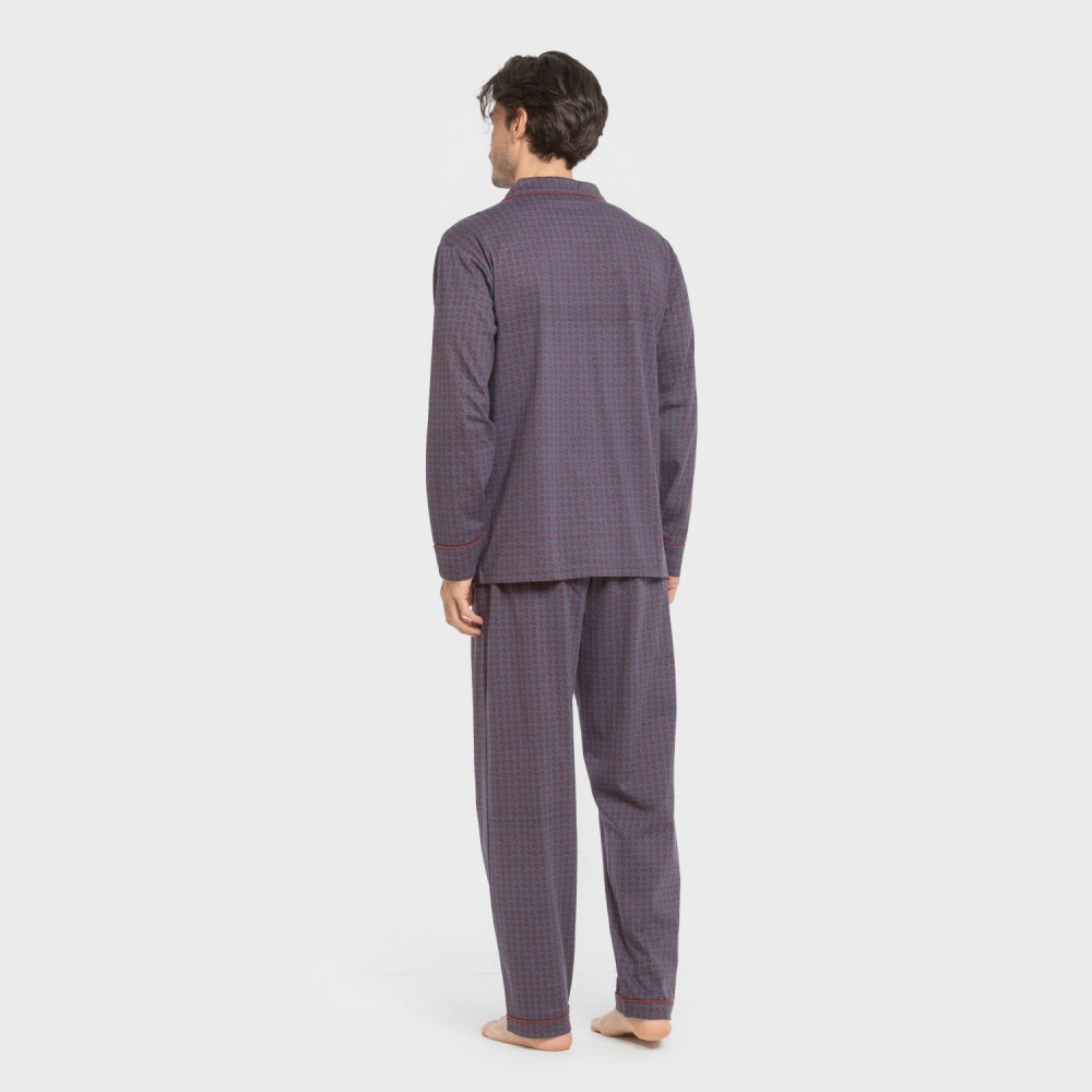 Pijama abierto de algodón con estampado discreto de cachemir en tonos burdeos sobre un fondo azul, incluye una camiseta con cuello de solapa y botones, y un pantalón con cintura elástica.