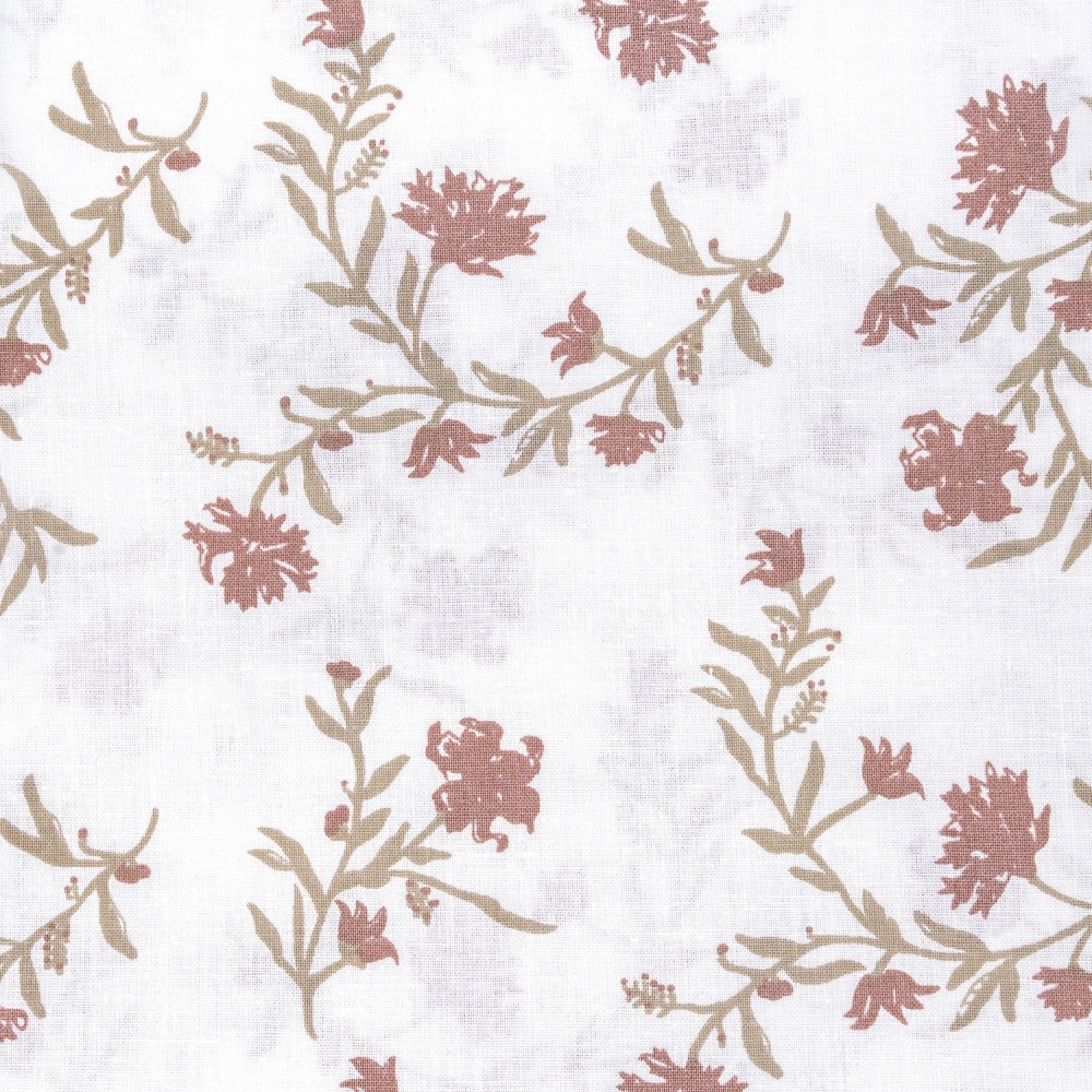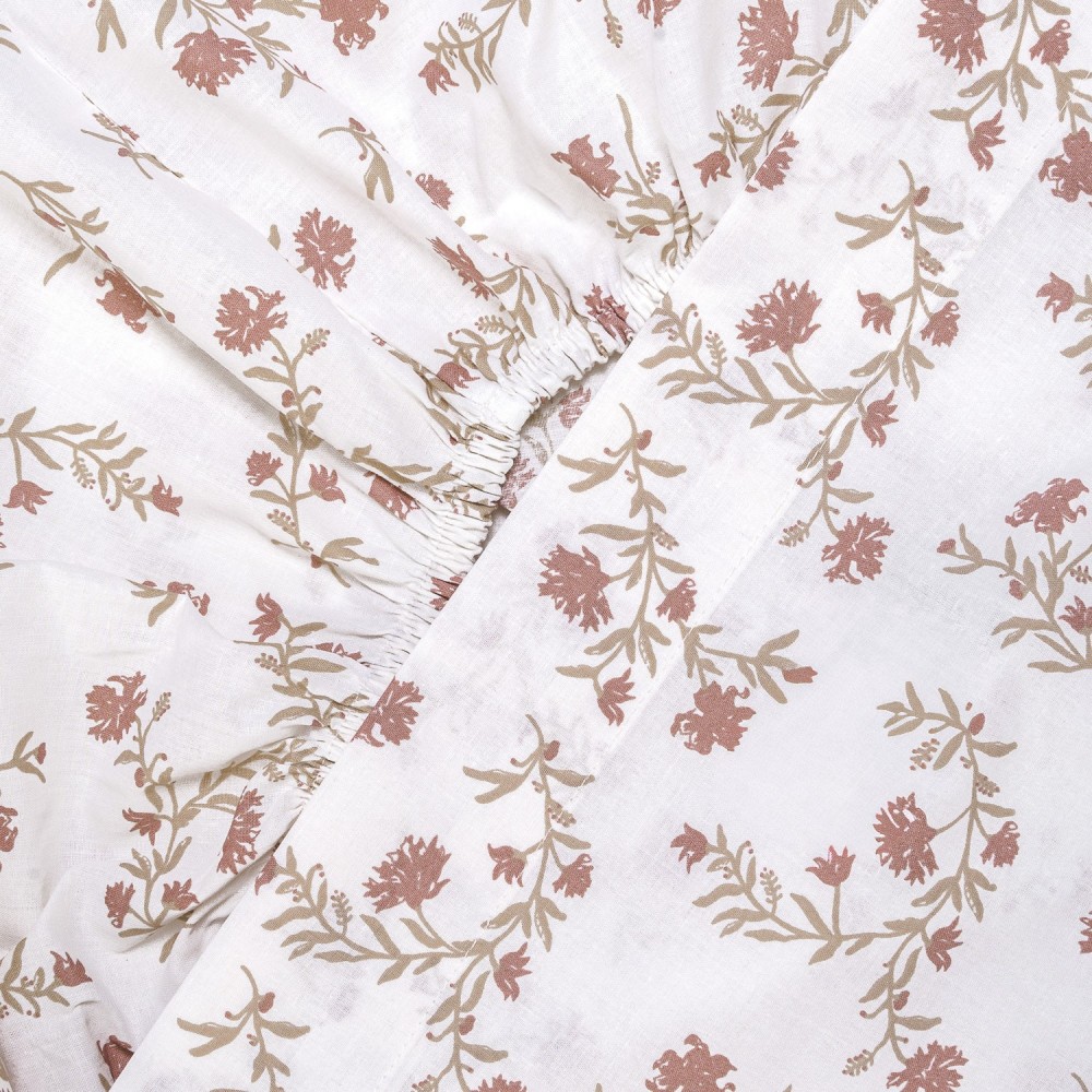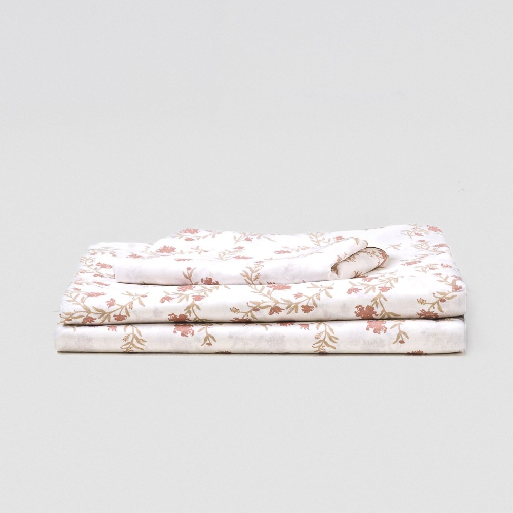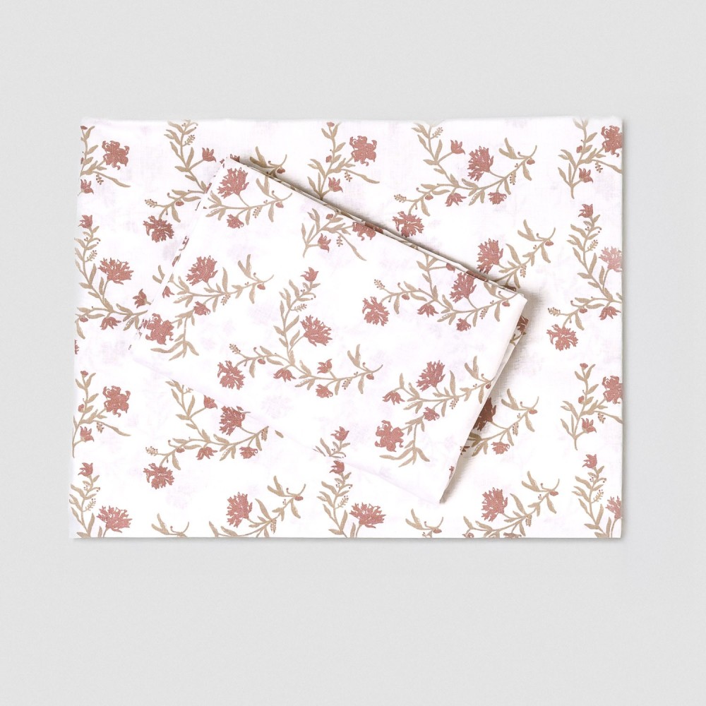 Sábanas y fundas de almohada blancas con estampado de flores en tonos rojos y grises