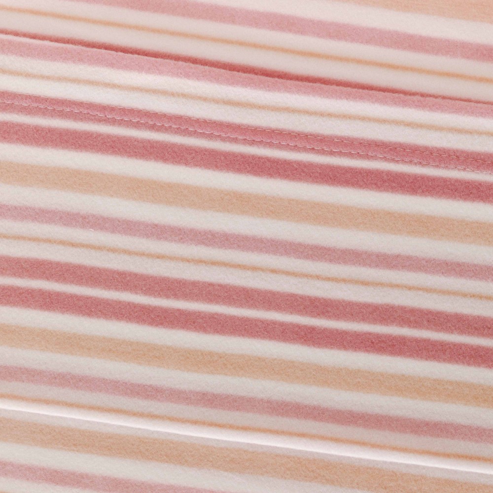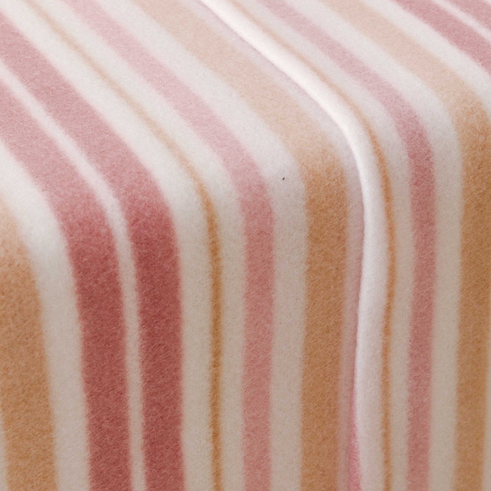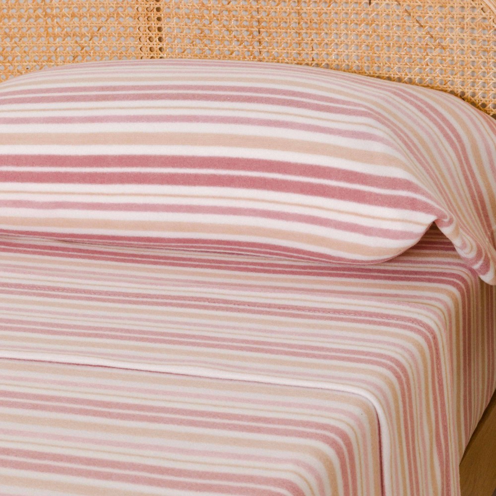 Sábanas y fundas de almohadas con estampado sencillo de rayas en tonos rosas y arena sobre un fondo blanco.