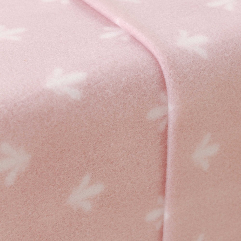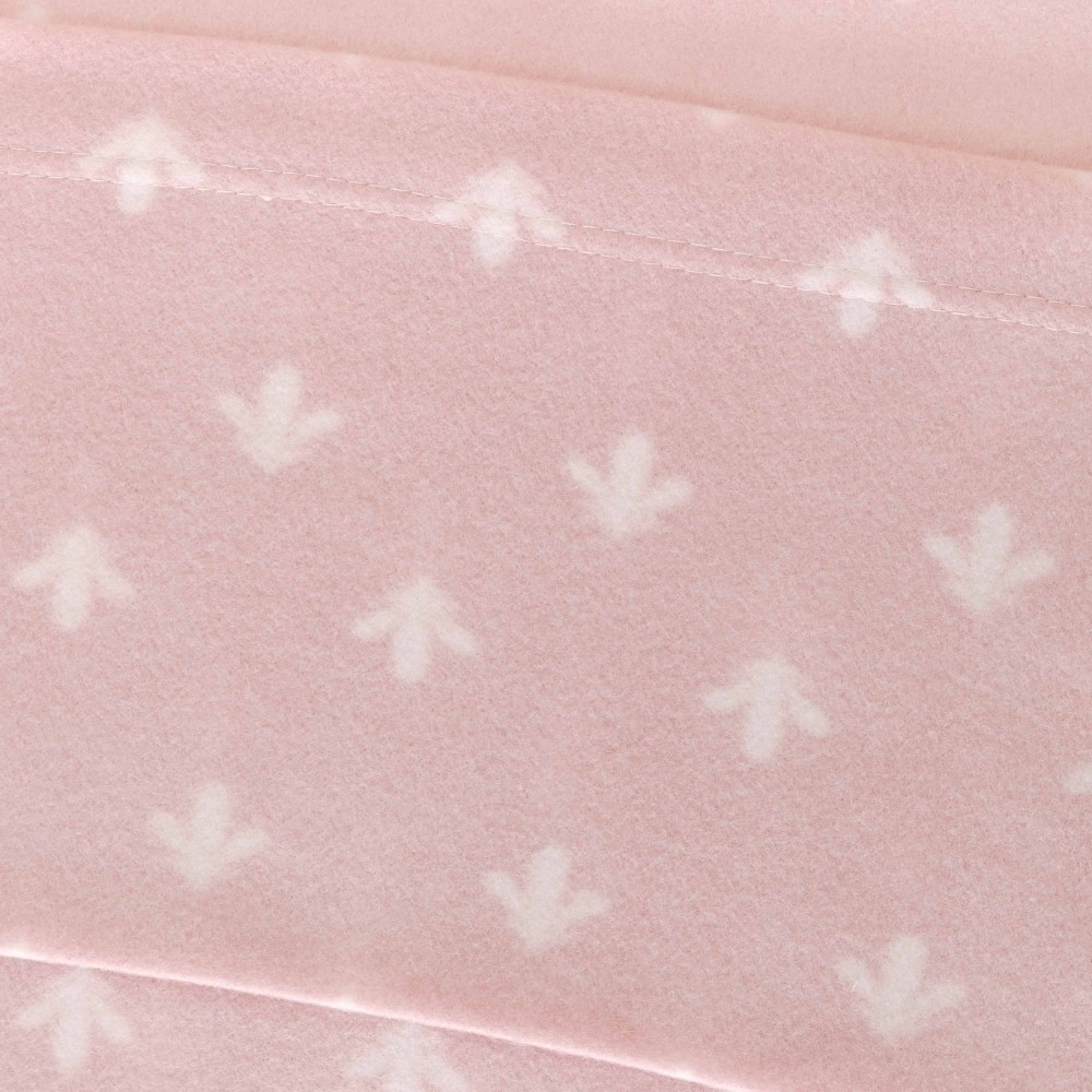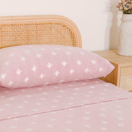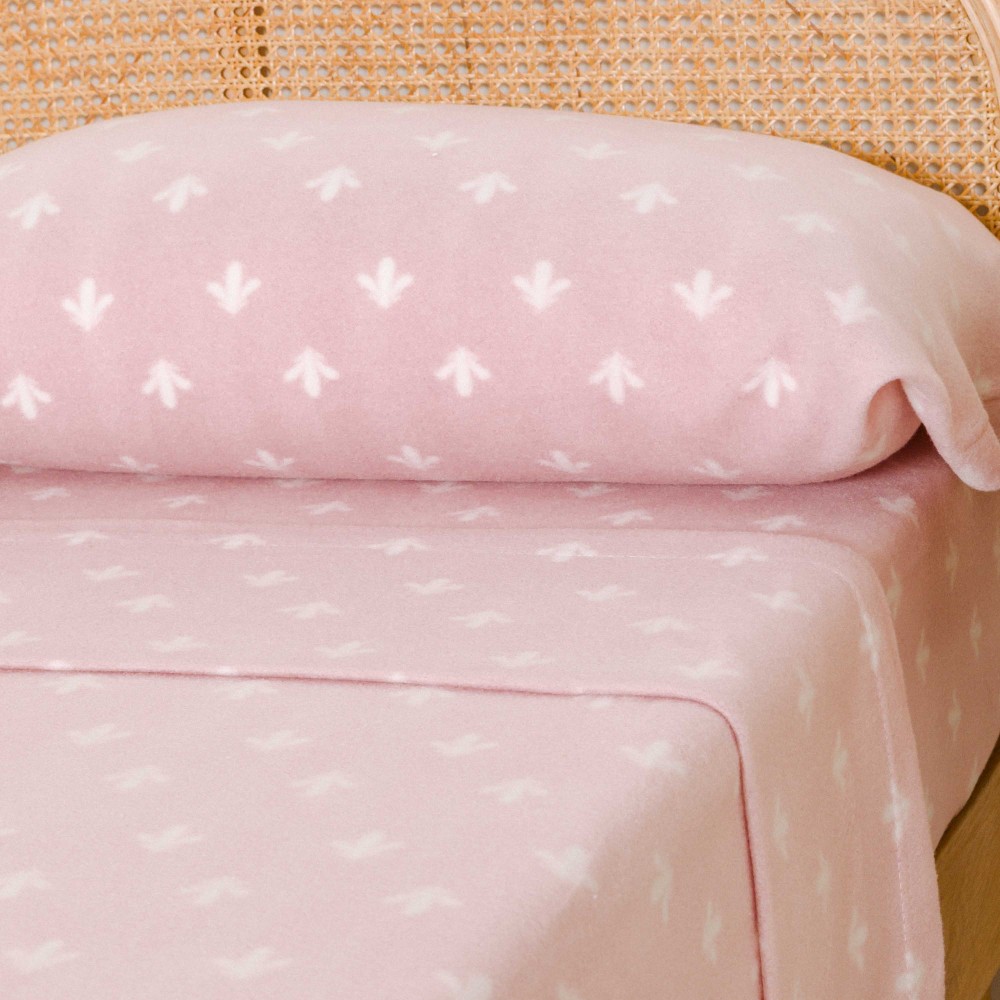 Sábanas y fundas de almohadas con discreto estampado de figuras blancas sobre un fondo rosa.