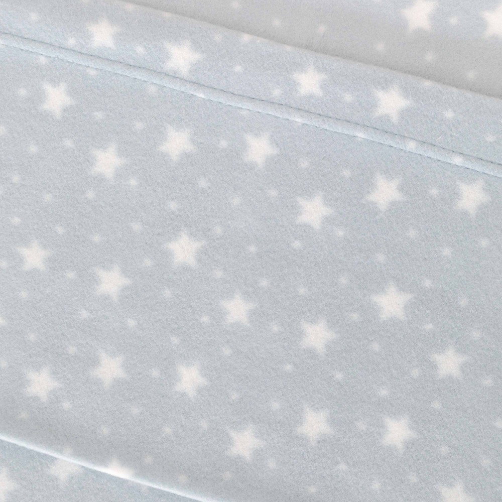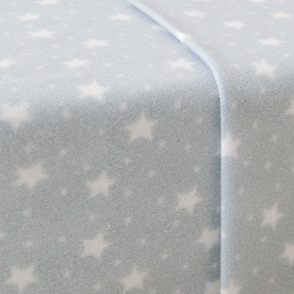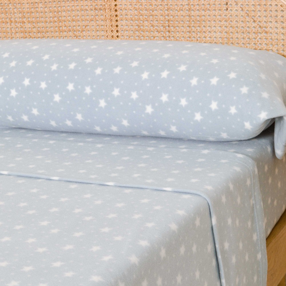 Sábanas y fundas de almohadas con estampado de pequeñas estrellas y lunares blancos sobre un fondo azul.
