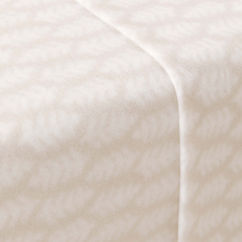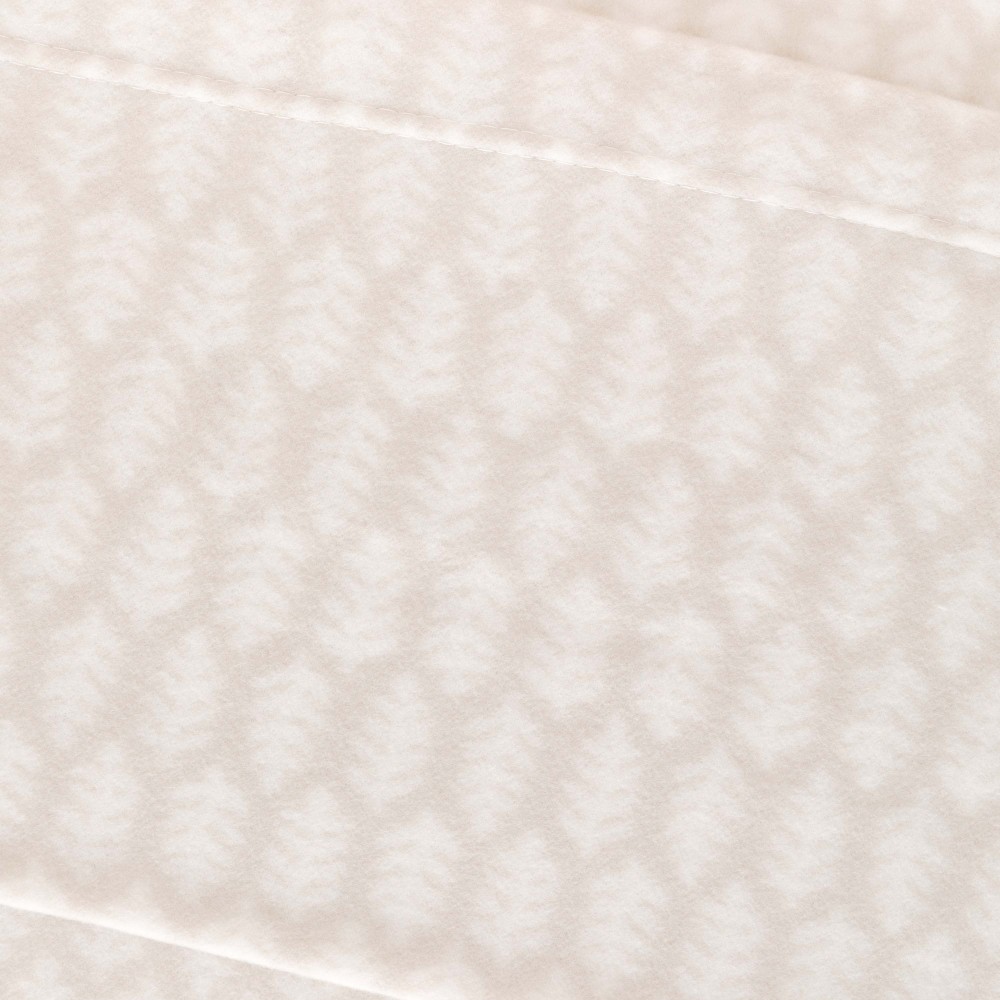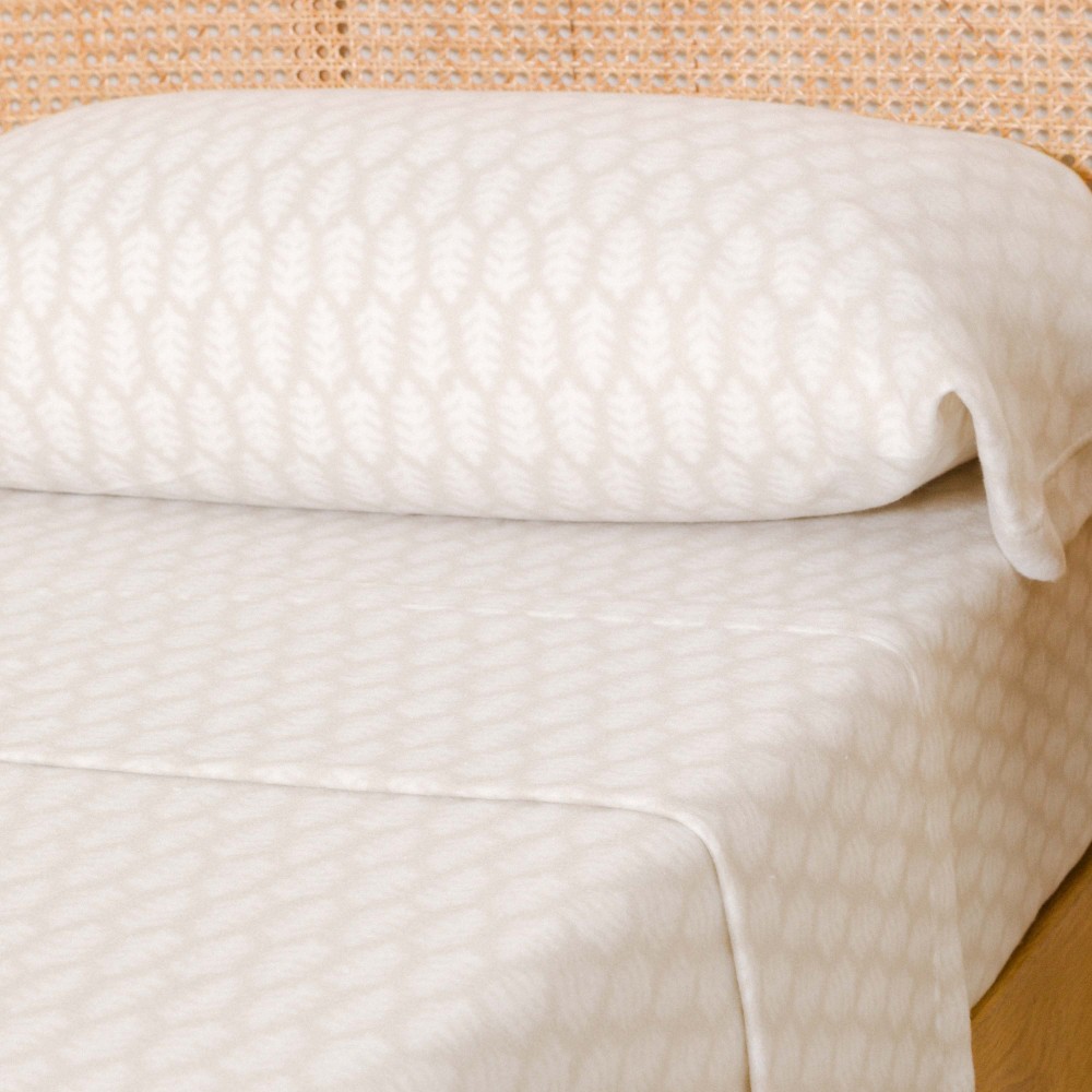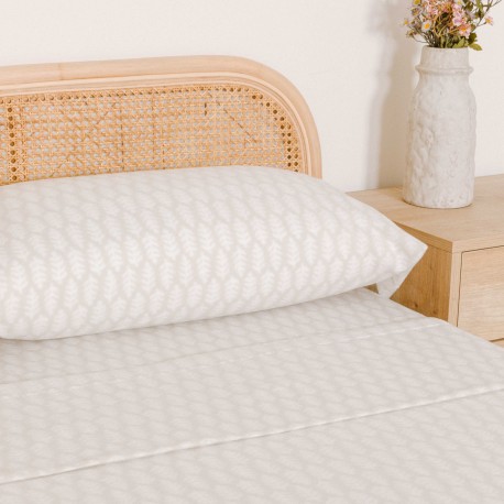 Sábanas y fundas de almohadas con estampado de hojas blancas sobre un fondo beige.