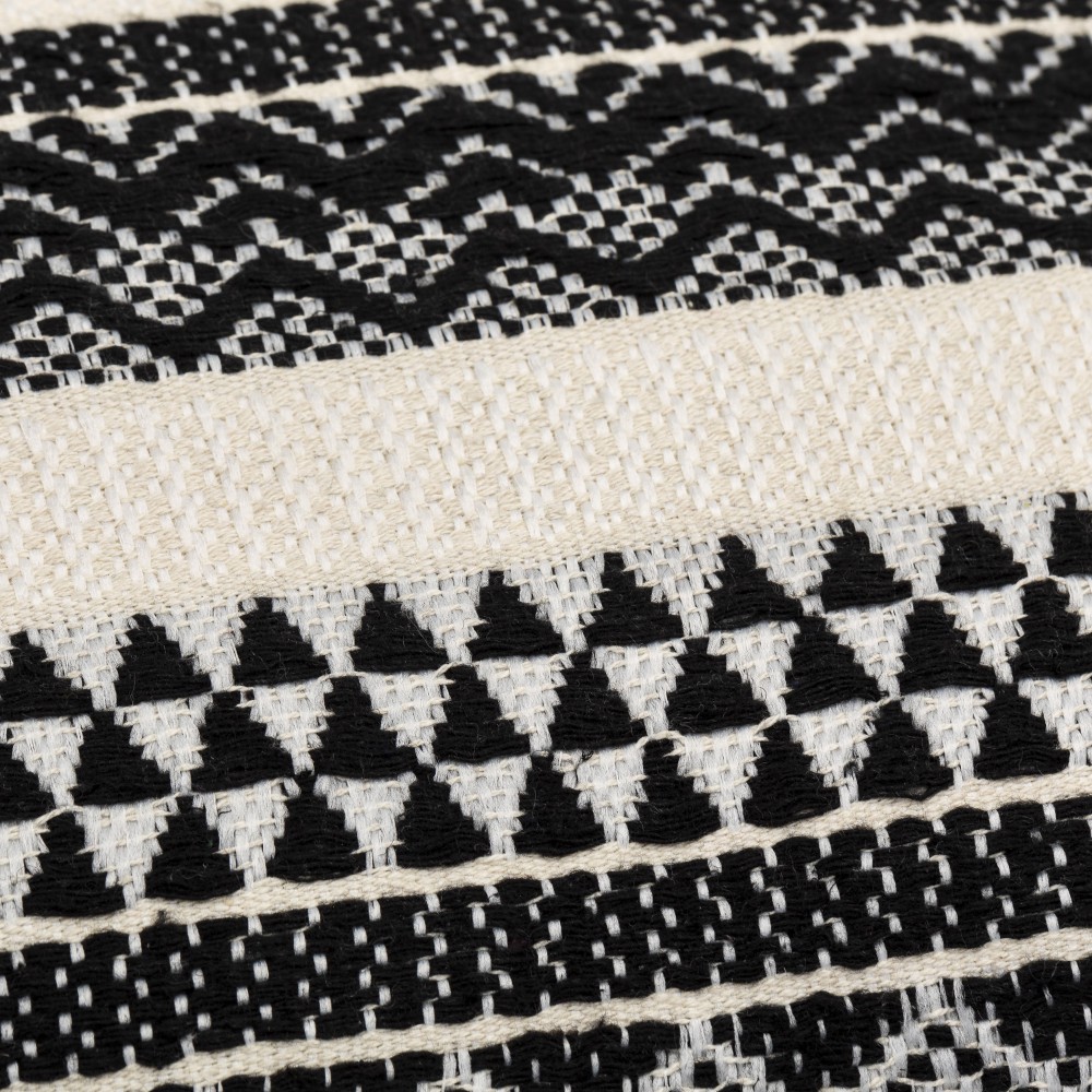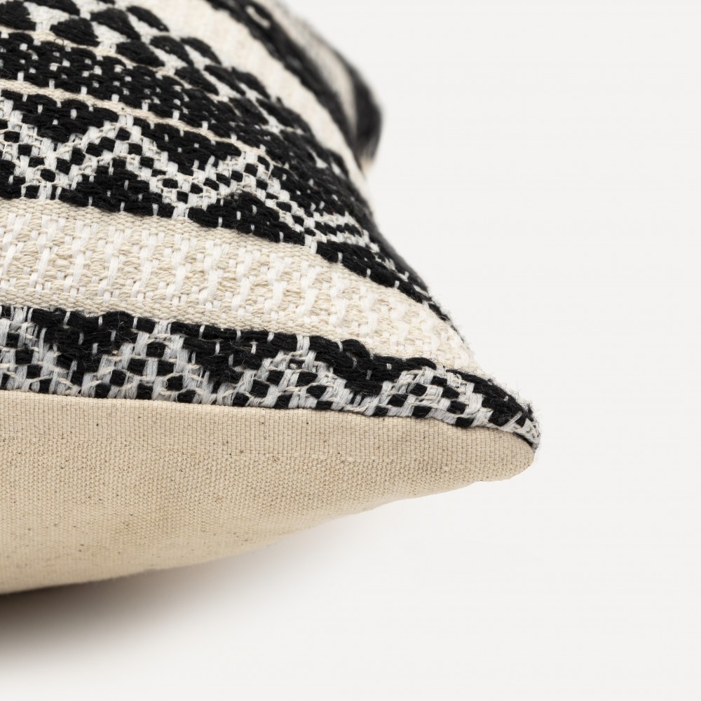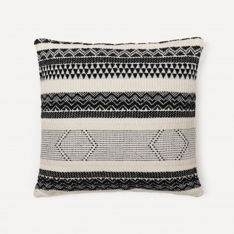 Tiene un estilo étnico con decoraciones sencillas de pequeños círculos negros formando figuras como rombos y zigzags sobre una base de color natural, la cara trasera es de color liso natural con una cremallera para poder desenfundar su relleno, aporta una decoración textil diferente que marcará el nuevo estilo de tu hogar si quieres hacer una decoración única con los cambios de temporada.