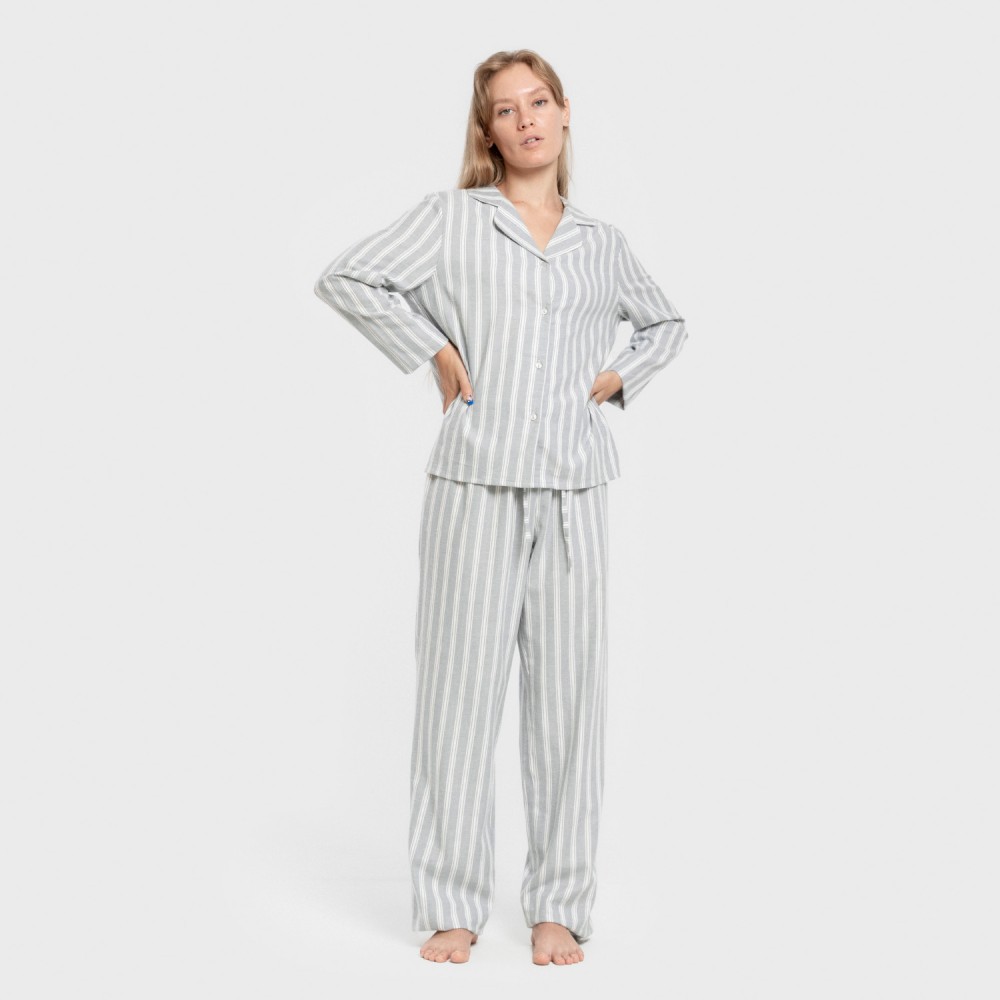 El pijama cuenta con una camiseta de manga larga con cuello y botones y un pantalón largo con elástico revestido y cordón de ajuste.