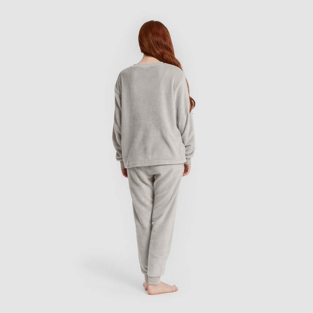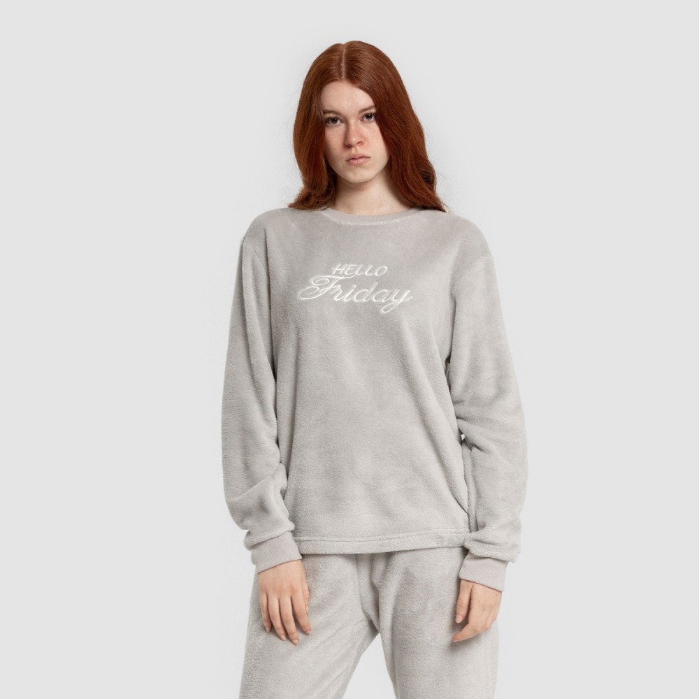 El pijama incluye una camiseta de color gris con texto en la parte central "Hello Friday" y un pantalón liso del mismo tono.