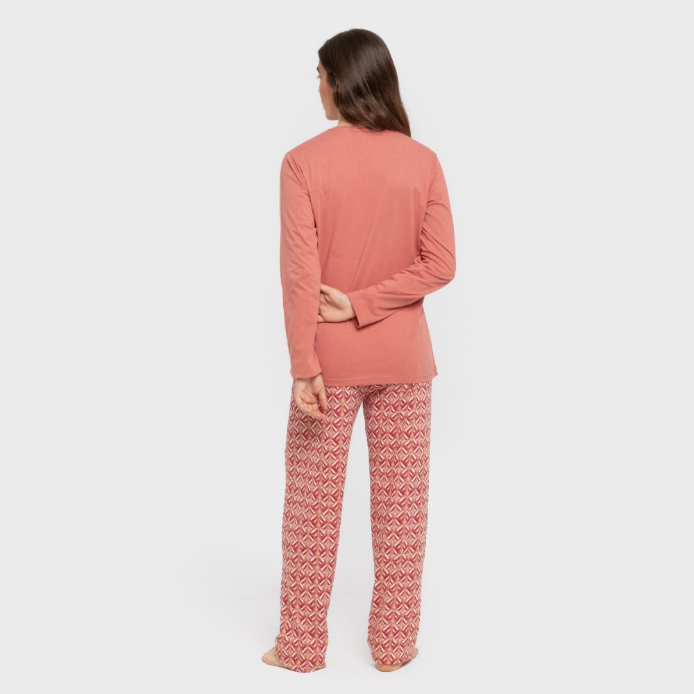 El pijama se conforma de una camiseta lisa de manga larga en color marsala con tres botones pequeños en la parte del cuello y un pantalón con estampado sencillo en tonos rosas y marrones sobre un fondo blanco. El pantalón del pijama tiene la cintura elástica recubierta con una cinta para ajustar.